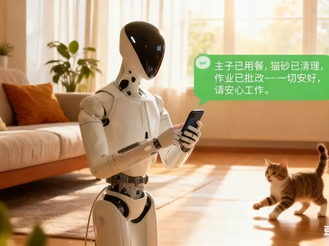 清晨七点,阳光透过窗帘洒进客厅。我还在出差途中,手机却弹出一条温馨提醒:“主子已用餐,猫砂已清理,作业已批改——一切安好,请安心工作。”