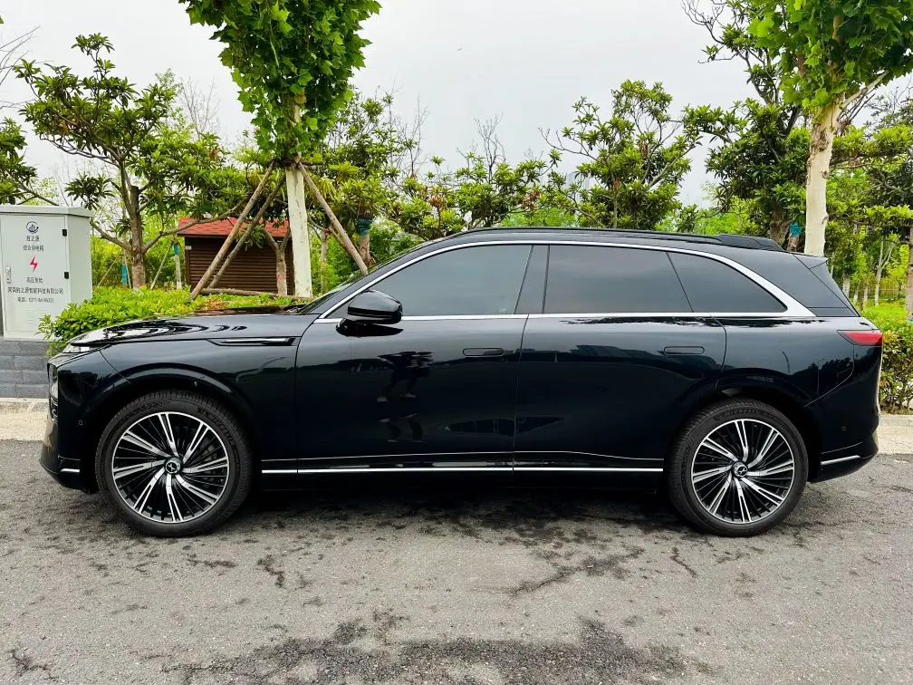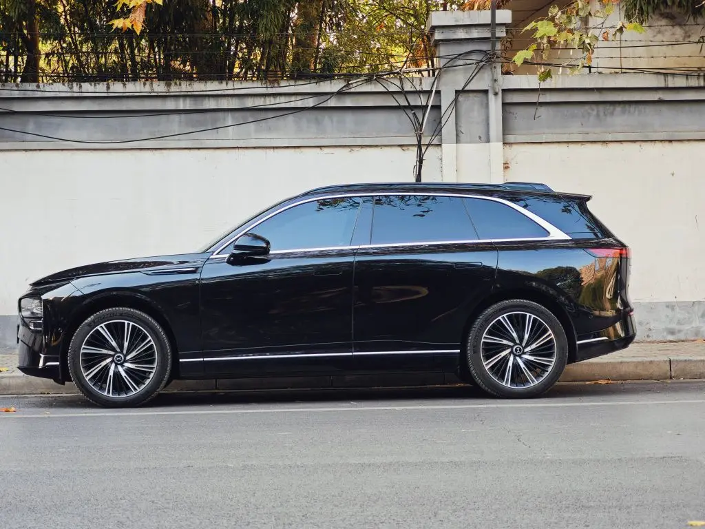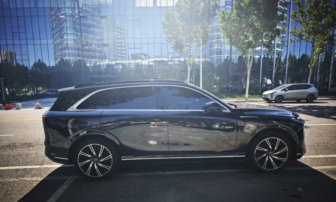 · 图片1:【晨曦中的侧影】清晨阳光下G9侧身照,流线型的车身与21寸大轮毂尽显豪华与力量感,光影勾勒出它优雅的线条。
