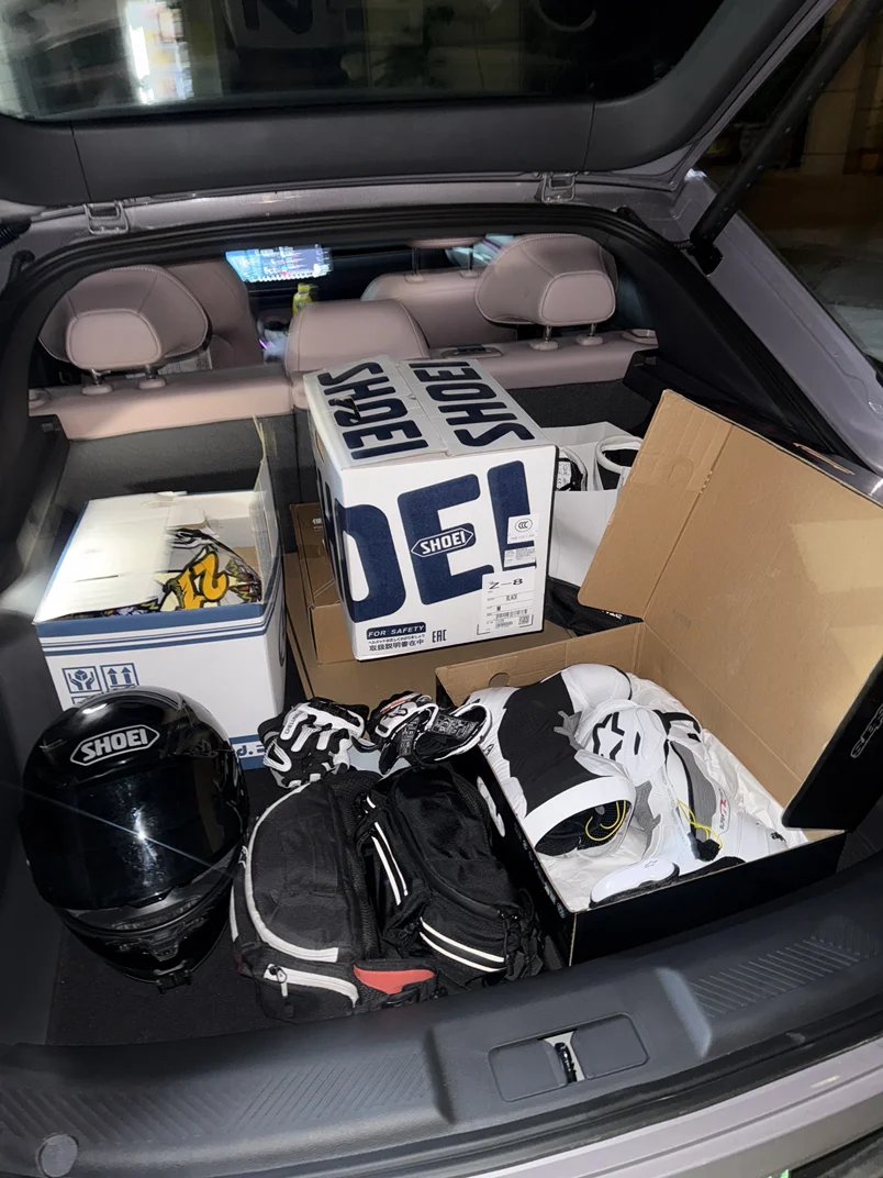 M03后备箱特别大,装了所有的摩托车装备,三四个头盔两双靴子完全没问题,超大后备箱嘻嘻
