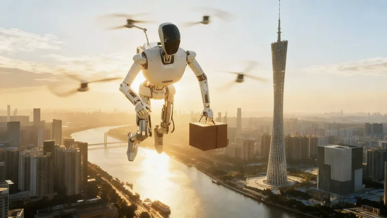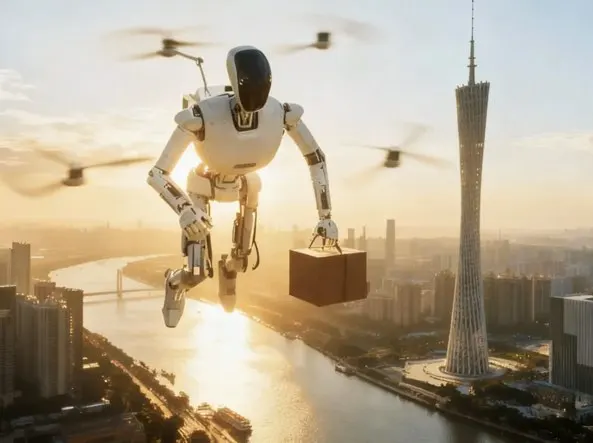 飞行机器人构建城市空中物流网络,实现极速快递配送,将包裹精准送到你手上。
