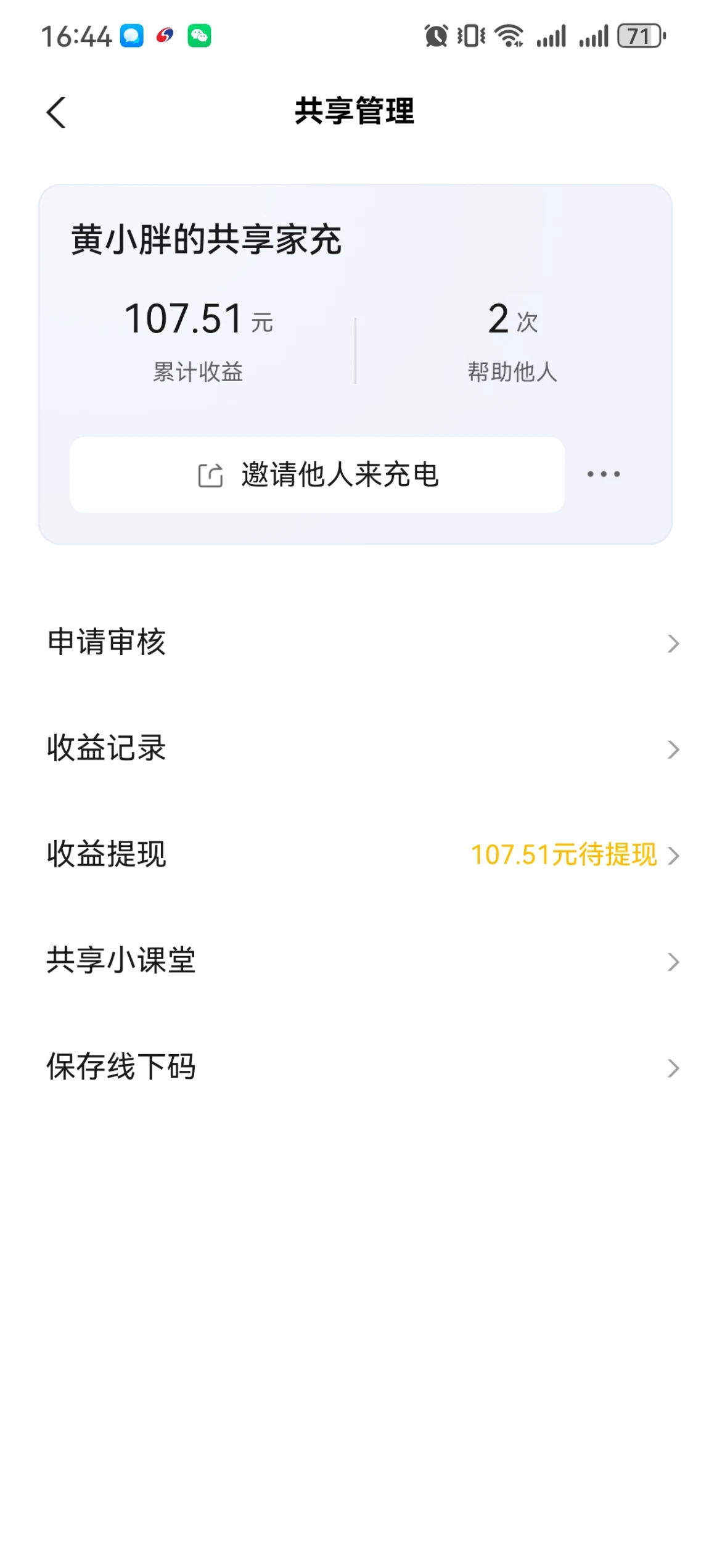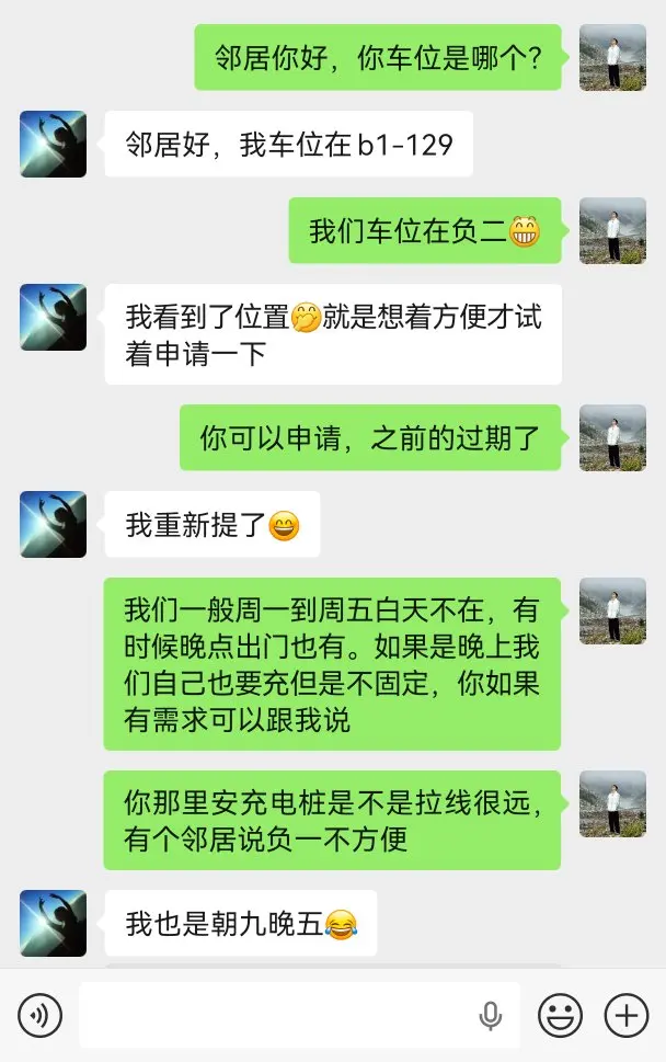 安装完成后,我参与了小鹏的共享充电桩活动,开通可送100积分。原本以为不会有人来用,没想到很快就有两位邻居联系我充电。