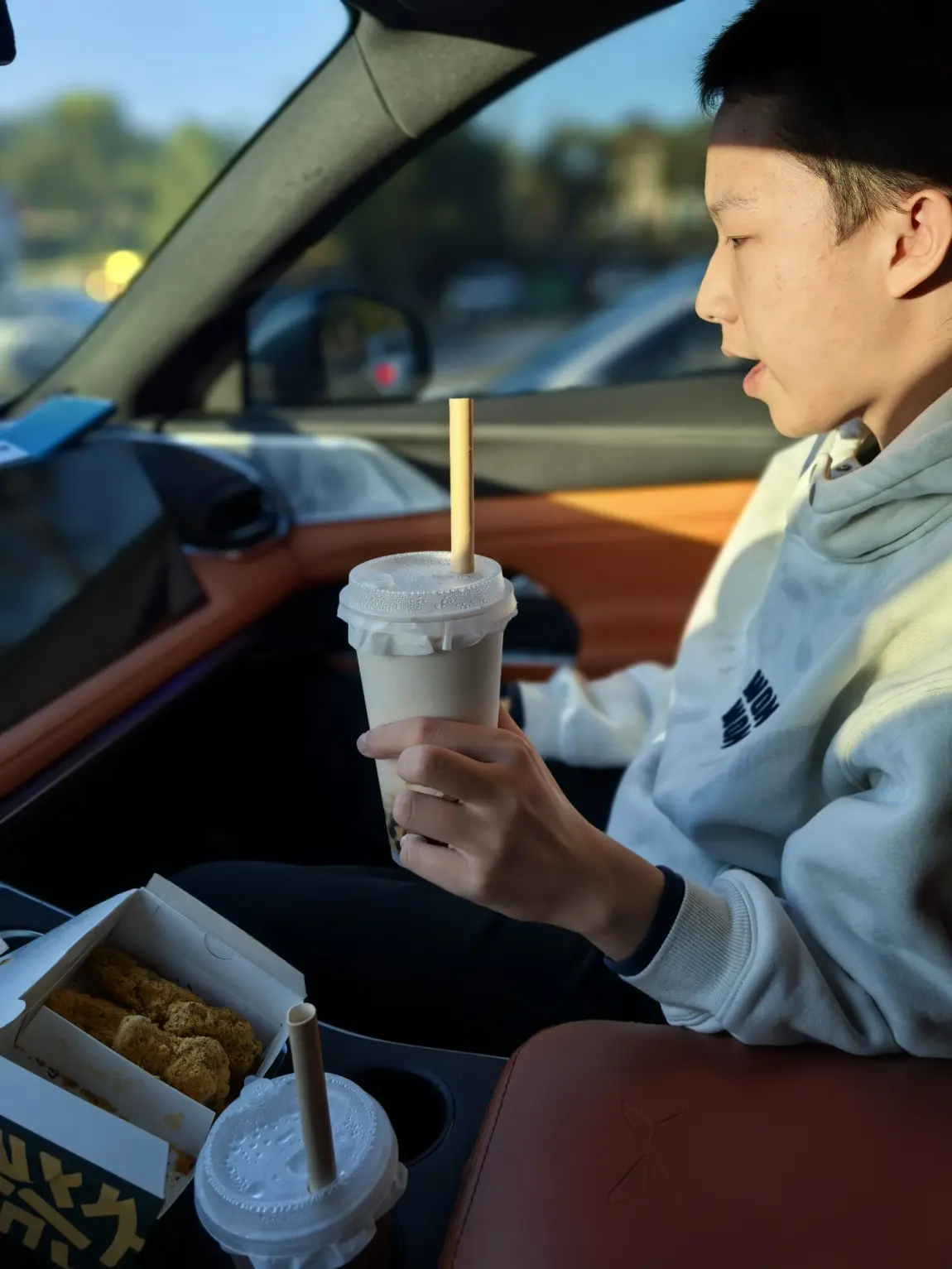 周末带他去仙岭湖喝下午茶,炸鸡和奶茶刚摆好,他就麻利地爬上副驾,瘫在零重力座椅上刷起剧来!这小子边吃边喊:“妈你开稳点,我要沉浸式追剧!”气得我直翻白眼,但看他舒舒服服葛优瘫的样子,又觉得这钱花得真值!