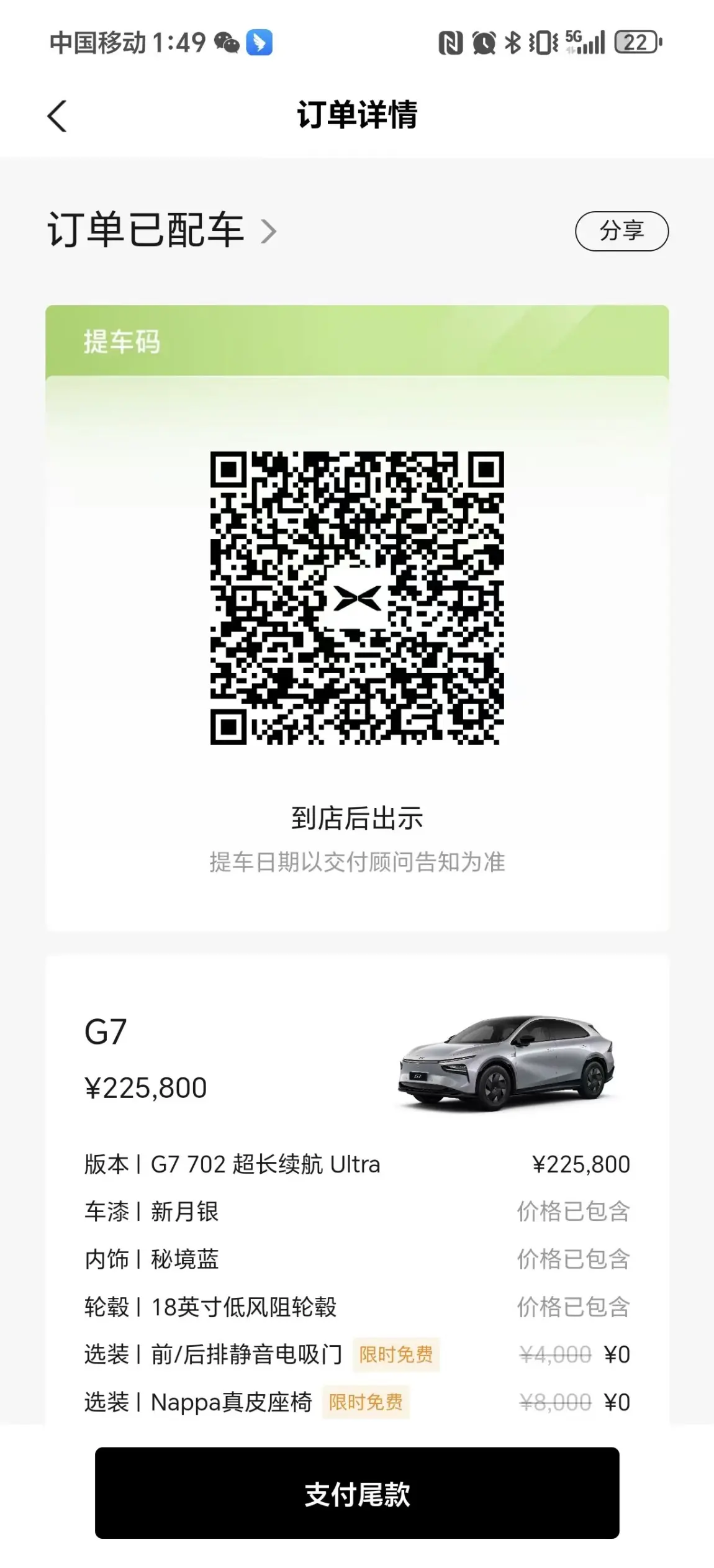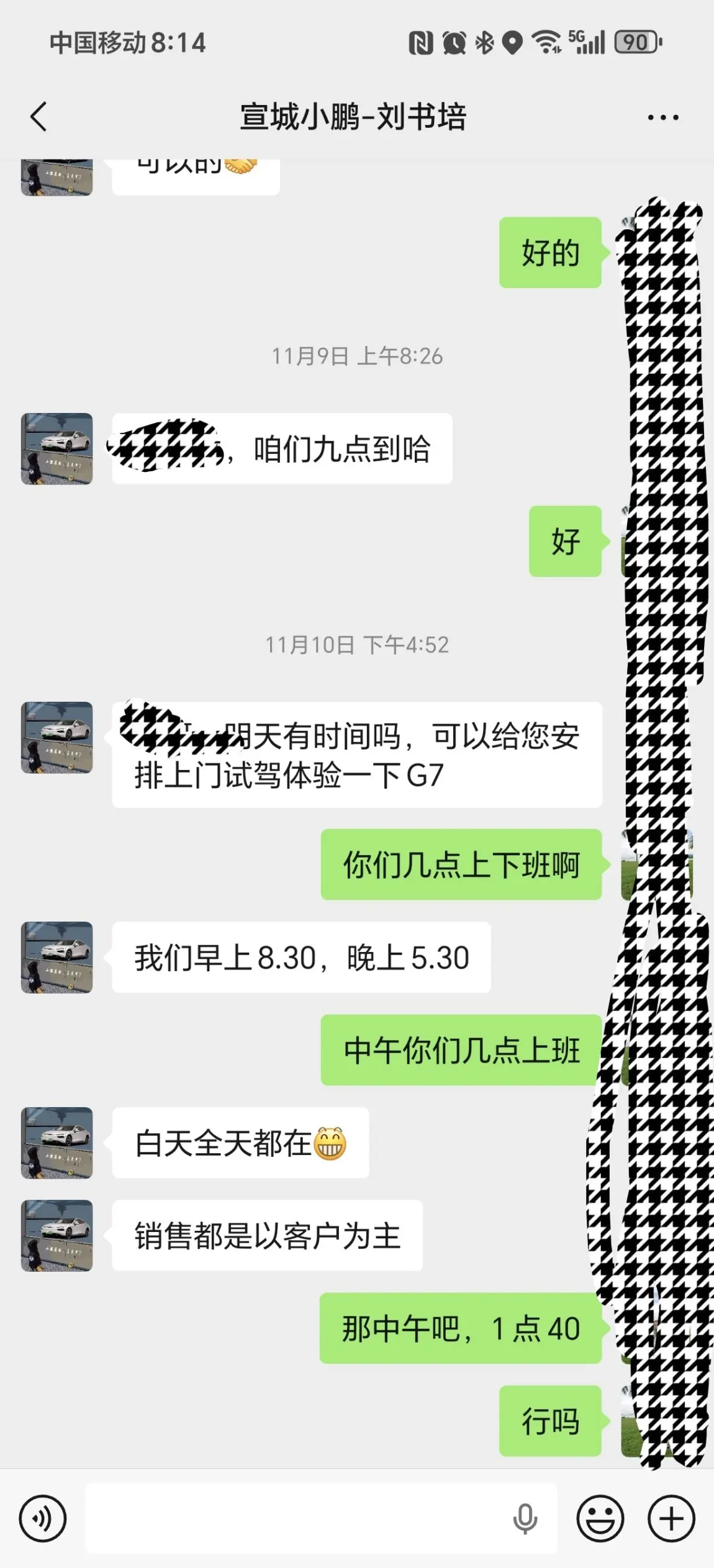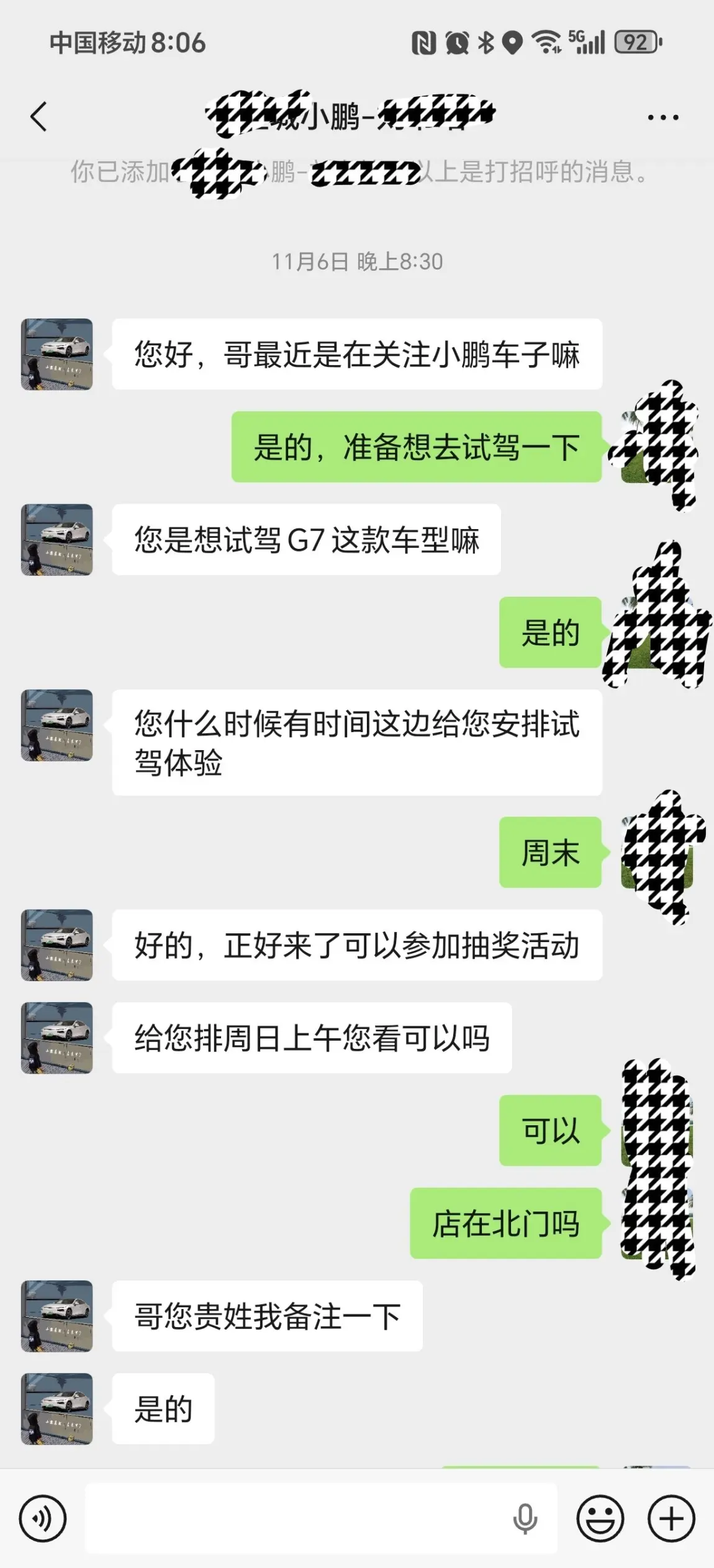 虽然是四线小城市,但本地正好就有小鹏店,第一时间试驾预约上。带着老婆和娃一起来到店内,略有遗憾的是当天到店心仪的G7到外地去了,在销售的建议下试驾了G6,虽然只是G6但试驾一番后,仍被NGP所吸引,感觉和自己开的油车简直不是一个时代的产物。ps:在店里我的娃看上了新款X9,因为门上的按钮他一按门就开了😄。小鹏的销售还是很给力,试驾完的第二天给我上门试驾G7,就这样对G7很满意确定了就是它了的想法。