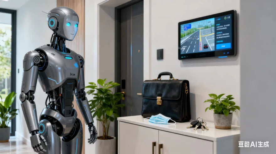 下午,Iron在玄关处为主人准备出门物品,它识别到主人的日程后,将公文包、钥匙和口罩整齐摆放在玄关柜上,同时电子屏显示交通路况和出行建议。Iron在客厅进行家务清洁,它一边用吸尘模块清洁地毯,一边用机械臂整理沙发上的抱枕,动作精准又高效,旁边的智能音箱播放着轻柔的音乐。