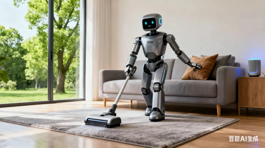 #小鹏Iron在身边# 上午,Iron在客厅进行家务清洁,它一边用吸尘模块清洁地毯,一边用机械臂整理沙发上的抱枕,动作精准又高效,旁边的智能音箱播放着轻柔的音乐。