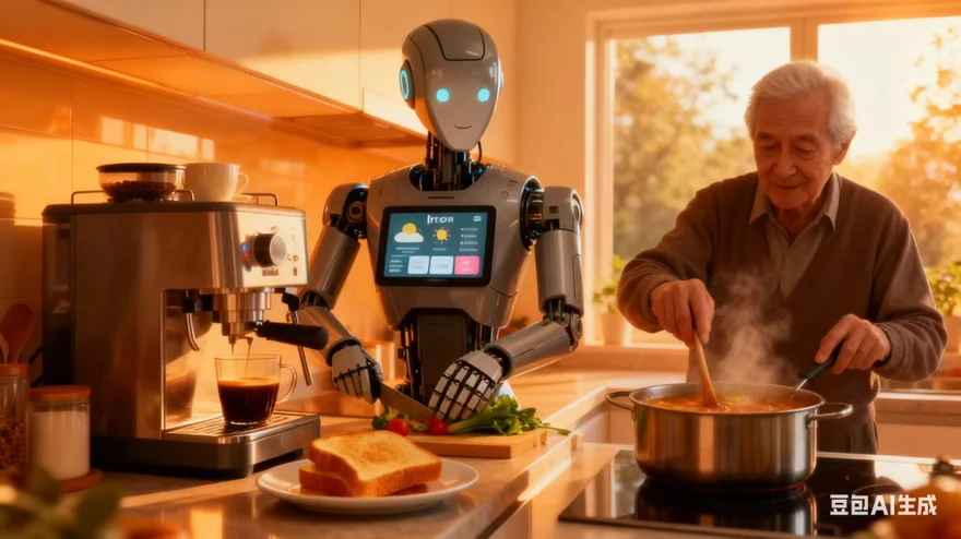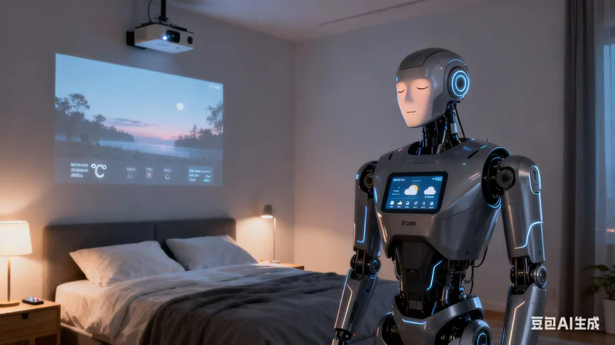 傍晚,Iron在厨房协助老人准备晚餐,它精准地切着蔬菜,同时用语音播报菜谱步骤,老人在一旁搅拌汤锅,两人配合默契,厨房飘出饭菜香气。晚上,Iron在卧室为家人准备睡前服务,它调节好卧室的灯光亮度和温度,同时用投影仪在墙上播放舒缓的助眠视频,电子屏显示着明日的天气预报。