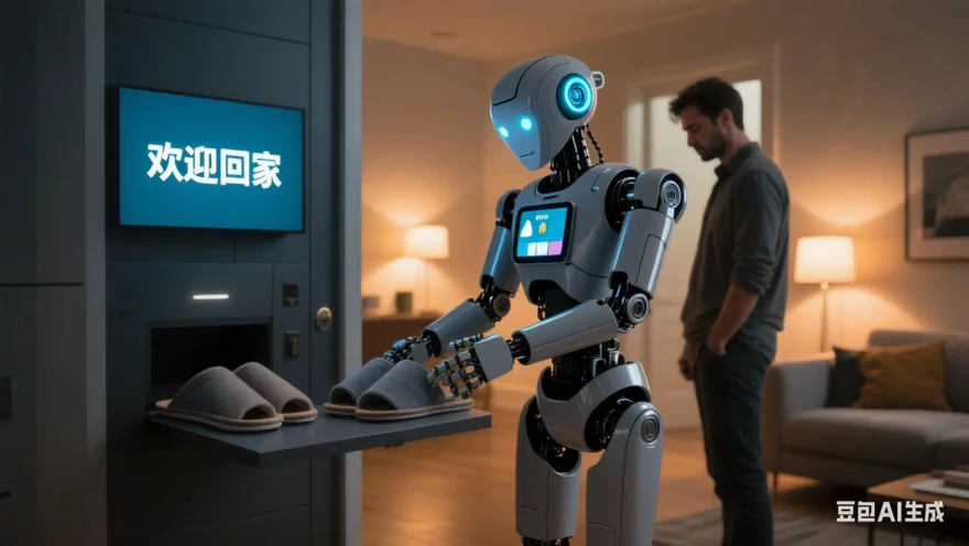 深夜,主人加班回家,Iron已提前调节好室内温度,在玄关处递上拖鞋,电子屏显示“欢迎回家,已为您准备热饮”,客厅留着柔和的夜灯。