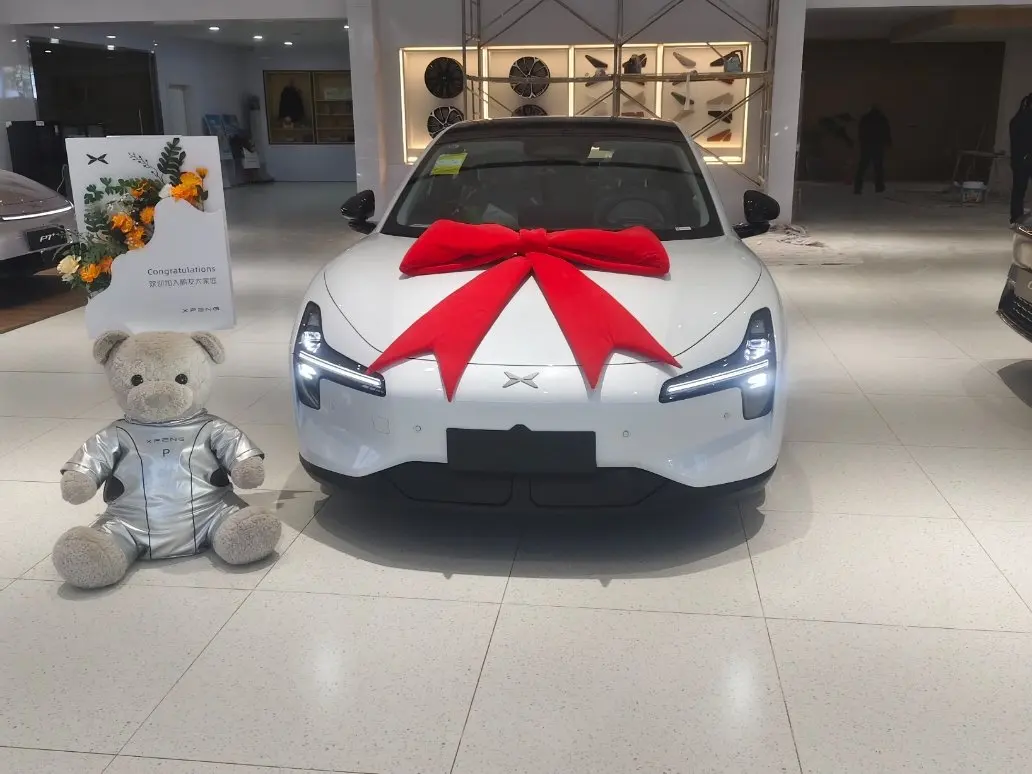去提这台小白的那天,一进店就看着车头怼着个大红蝴蝶结,销售还递了束白玫瑰——虽说咱平时不爱整这些花里胡哨的,但这排面确实给足了。灯光下绕车转了两圈,这前脸的线条是真利落,尤其是那个X标,瞅着就挺有劲儿。