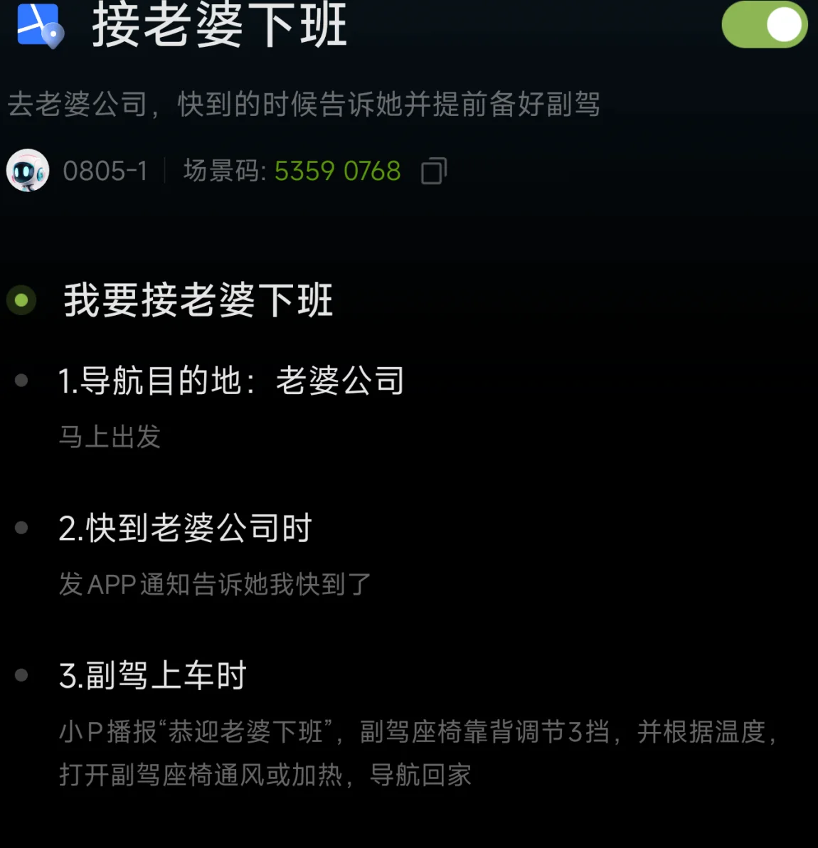 忘记老婆公司地址不要紧,每次需要导航地址麻烦,没关系,提前设置好场景,喊一声小p自动导航到老婆公司楼下,配合ngp更是舒服的一批