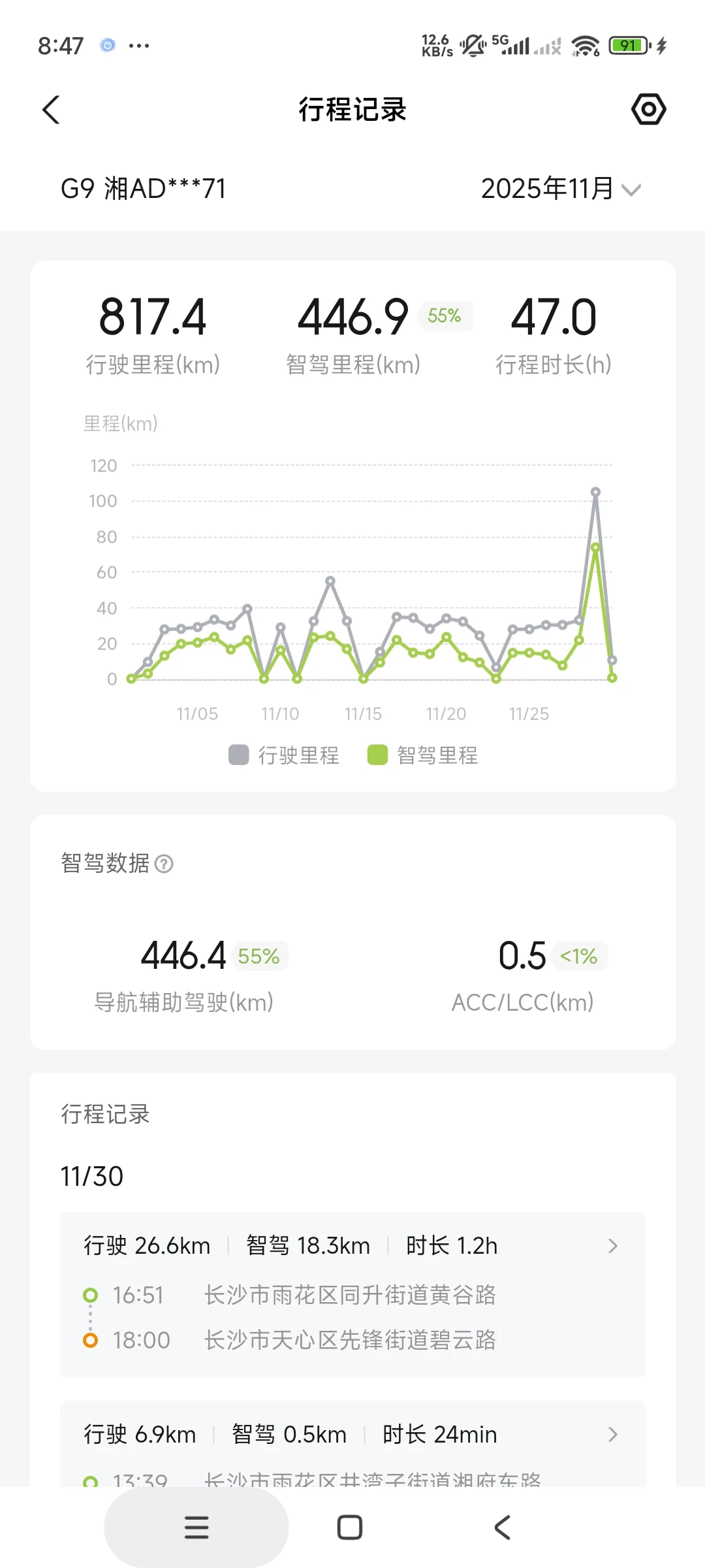 整个11月份,我共计行驶800多公里,智驾就占400多,可以说上下班正好平分,毕竟我上班赶时间,下班就悠哉悠哉了