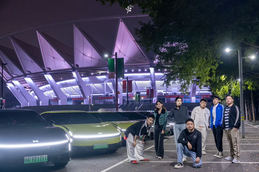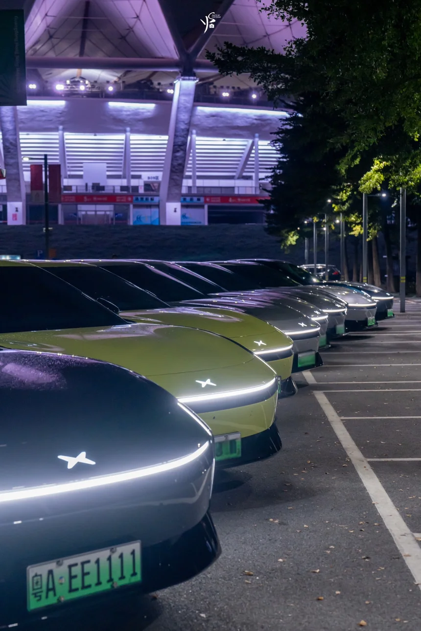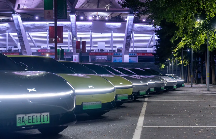 当队列整齐的小鹏新P7驶过佛山世纪莲体育中心的广场,流线型的车身与极具设计感的场馆建筑相映成趣,瞬间成为了这片城市地标里最亮眼的风景线。
