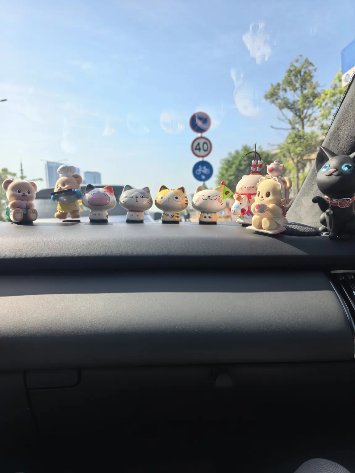 清晨的阳光漫过车窗,落在副驾那排软乎乎的小摆件上——带着厨师帽的小熊举着面包,几只圆滚滚的猫咪歪着头看我,还有那只戴着红领结的小黑猫,总像在等我给它讲今天的新故事。