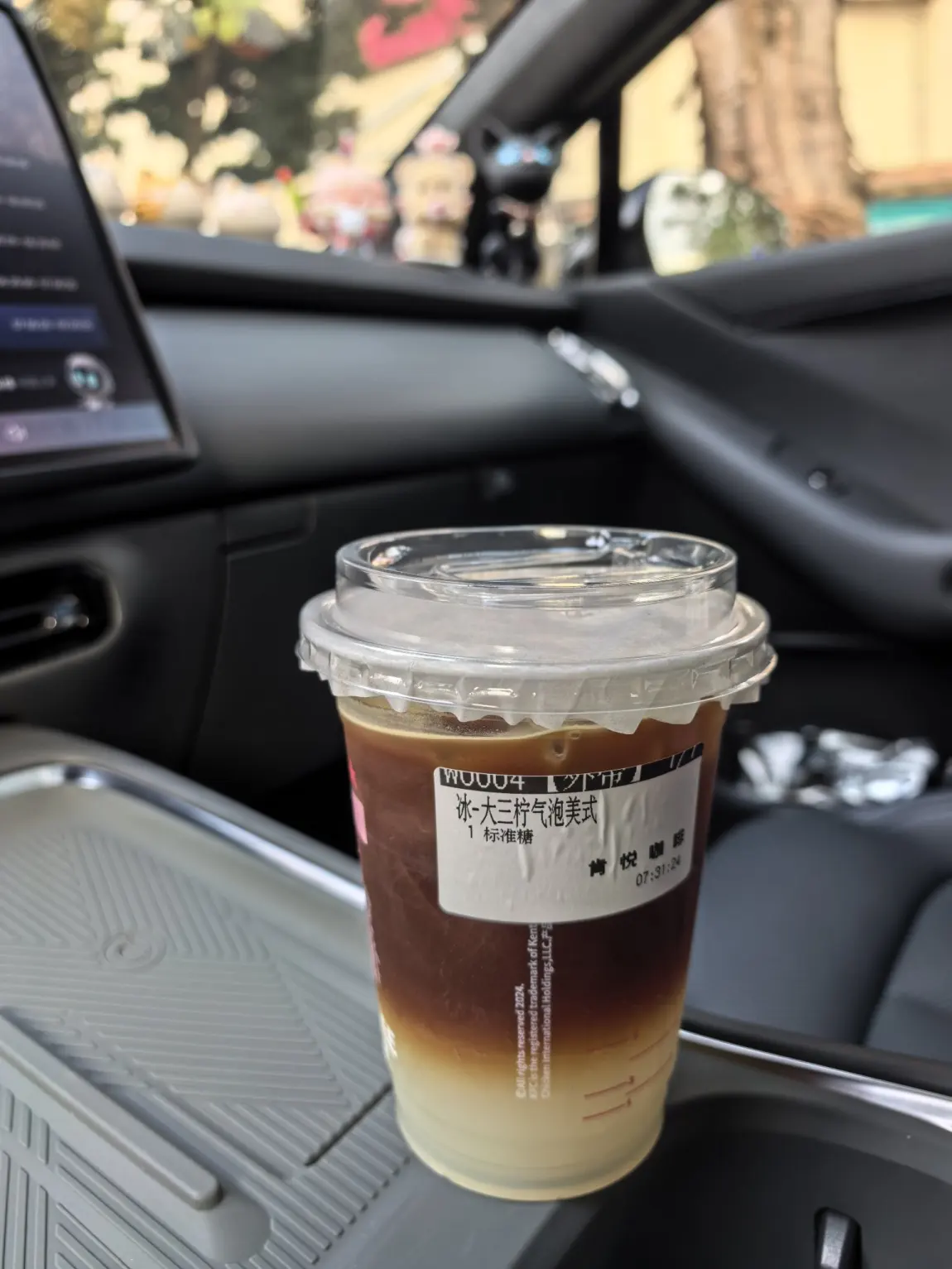 今天的副驾杯架里,躺着一杯分层漂亮的“冰大三柠气泡美式”,杯身的水汽在空调风里慢慢化成小水珠。从咖啡店到车库不过5分钟,但撕开杯套的瞬间,柑橘的清爽混着咖啡的微苦,再配上紫灯漫过杯身的朦胧感,已经把“要开启新一天”的信号递到了心里。