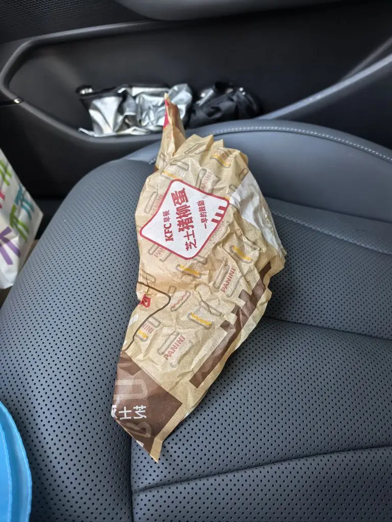 KFC的帕尼尼面包,是早起时怕自己会饿,特意绕路买的“安全感”。座椅的透气孔里还留着昨天放的香片味道,混着面包的麦香,在紫色光晕里酿成了独属于副驾的“幸福气息”。
