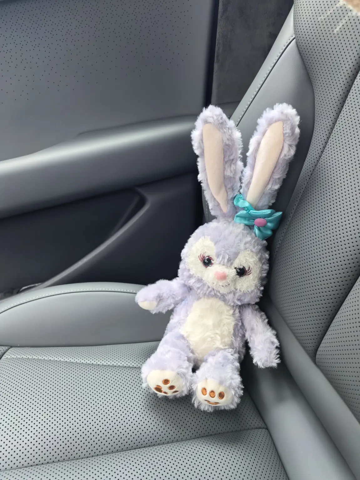 星黛露坐在副驾上,绒毛被紫光映得泛着淡淡的粉。每次急刹时,它的长耳朵会轻轻晃一下,像在说“慢一点呀”。而那排小摆件更有意思,路过减速带时它们会跟着晃成一排,在紫灯里像在跳一支温柔的“摇摆舞”,可爱又治愈。