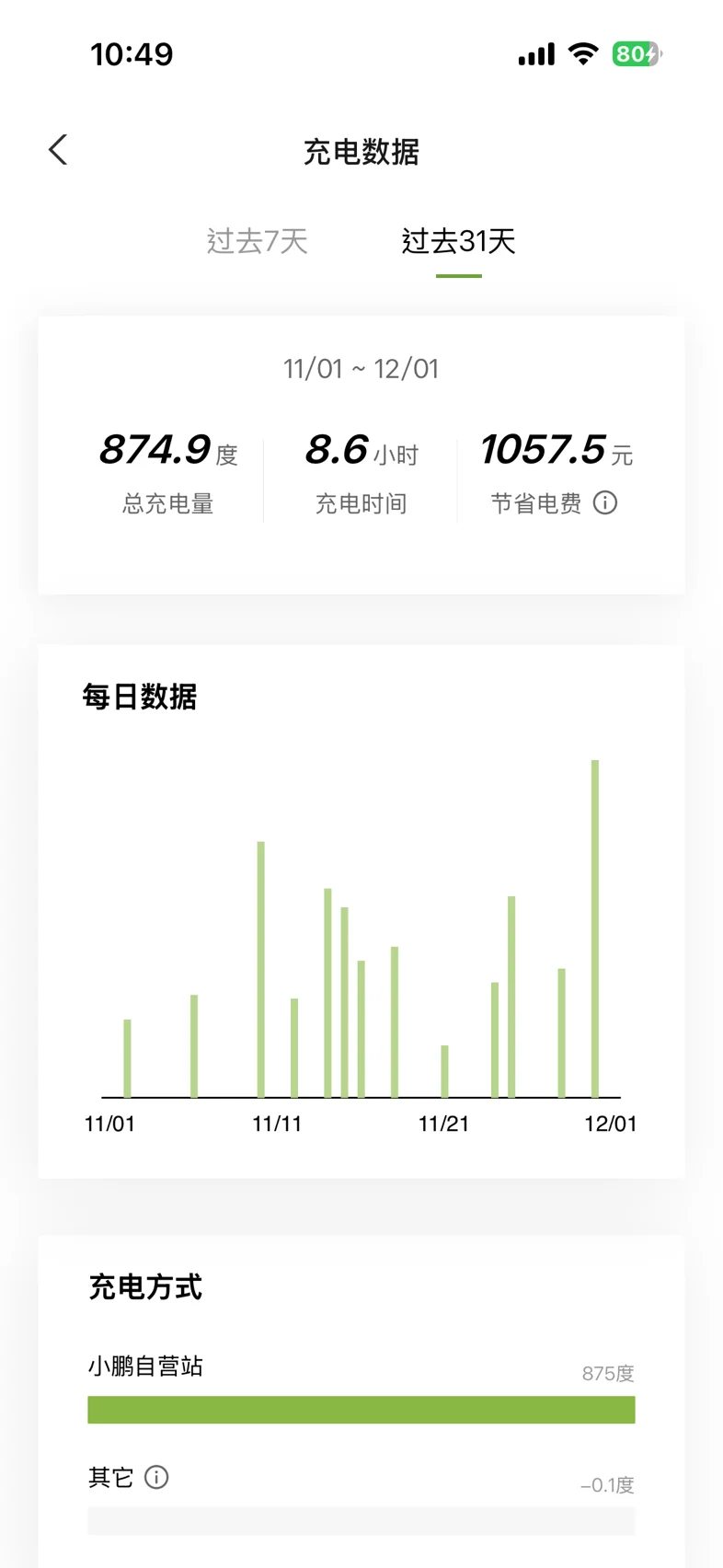 1,这个月我在小鹏自营充电站充了 800 度的电,快充总共给我节约了 10 +小时,节省电费 1000元,用的免费电卡,香迷糊了。
