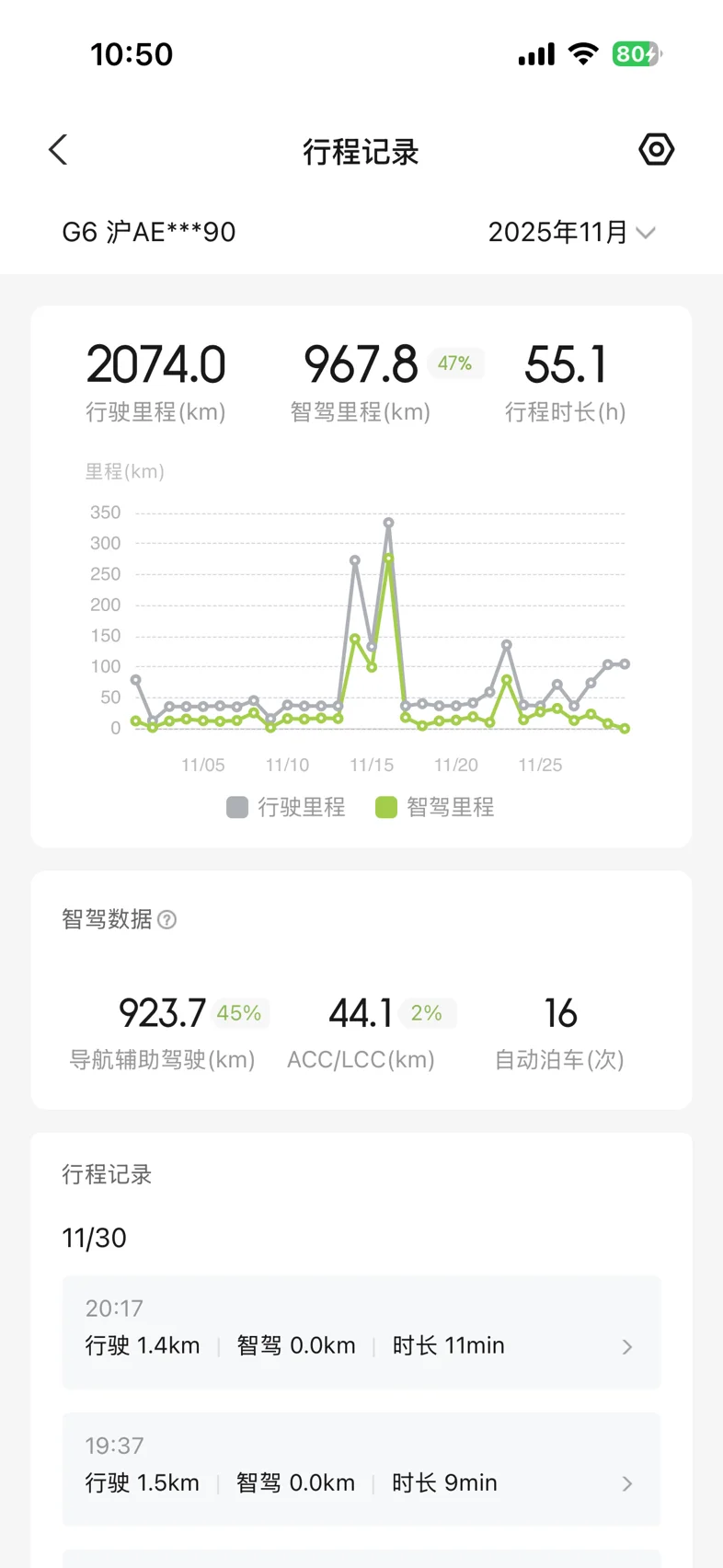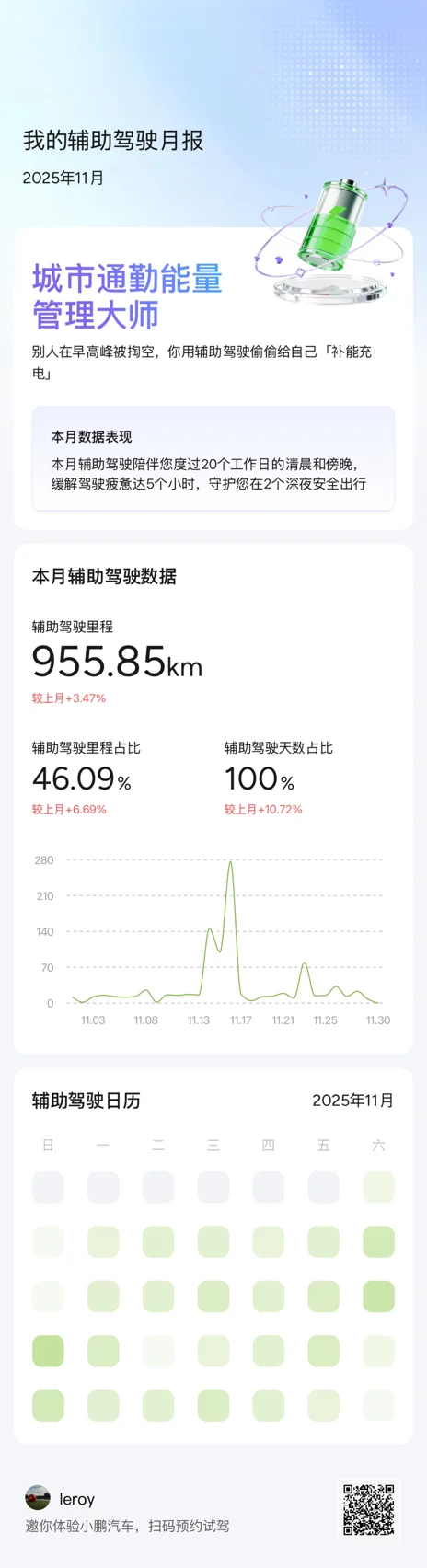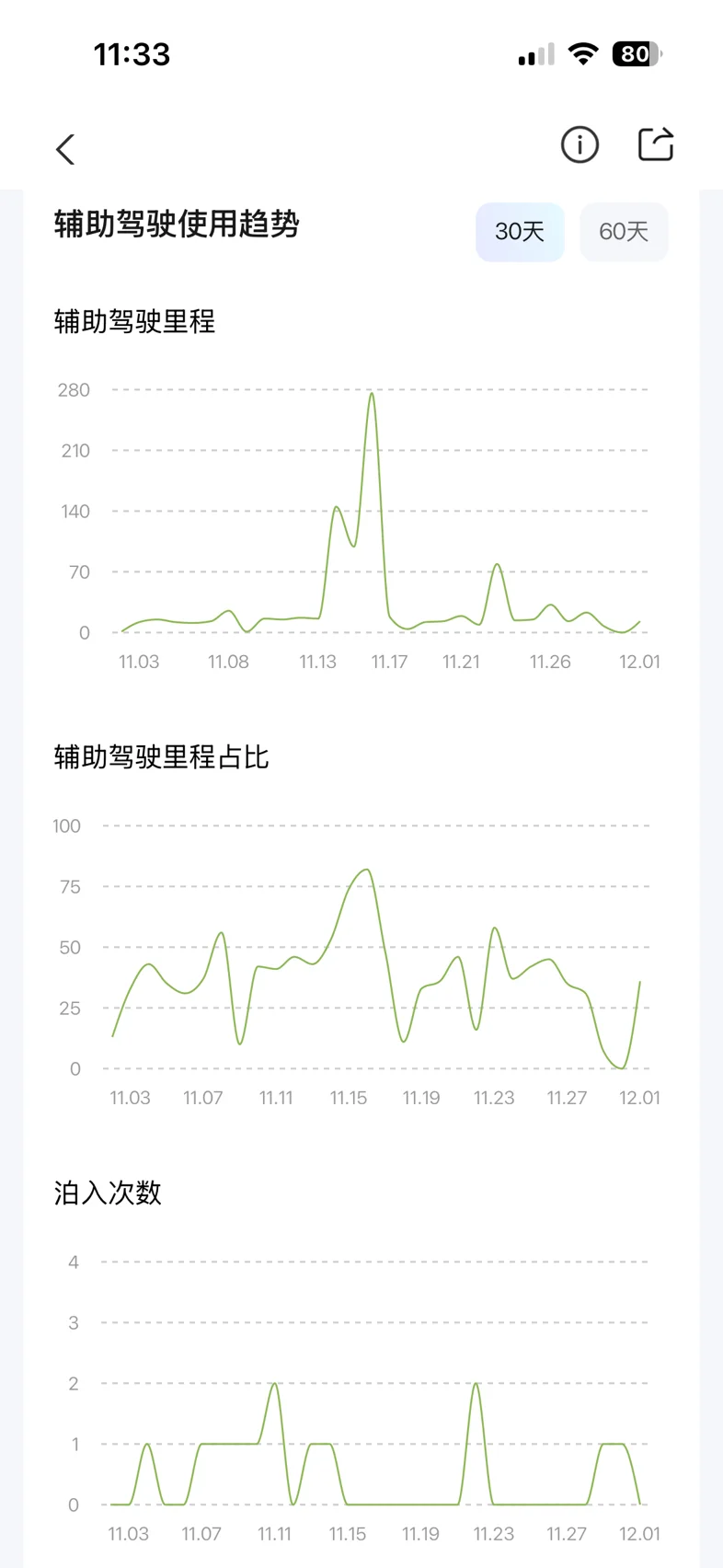 11月智能辅助驾驶比上个月又提高了4个点,辅助驾驶天数100%,我现在开车真的离不开小鹏的这个智能驾驶啦,用完就想一直用。