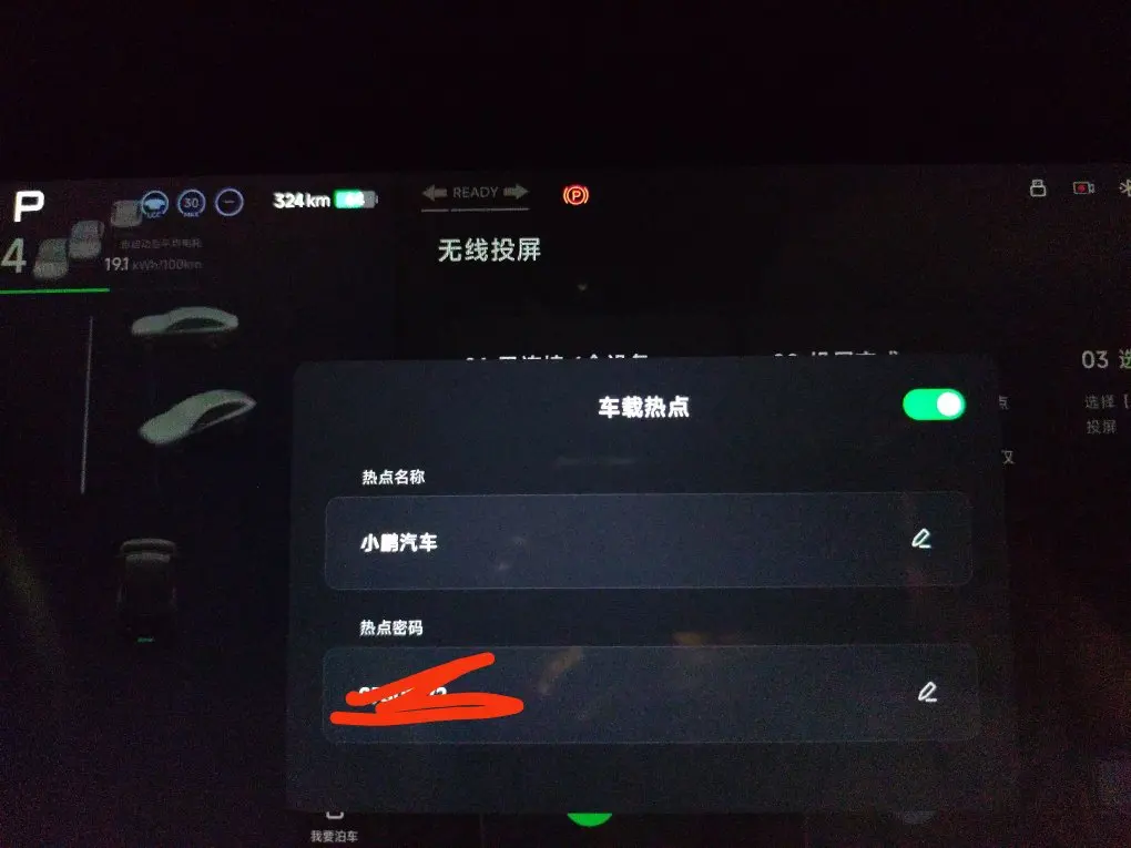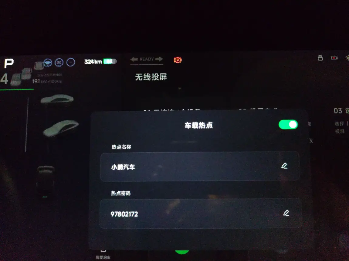 在 MONA 03 的中控大屏上,进入 应用中心 / 我的应用,可以看到一个叫 无线投屏(图2) 的图标。点进去之后,界面上会显示车机的 WiFi 热点名称和一个 8 位数密码,比如「小鹏汽车」。