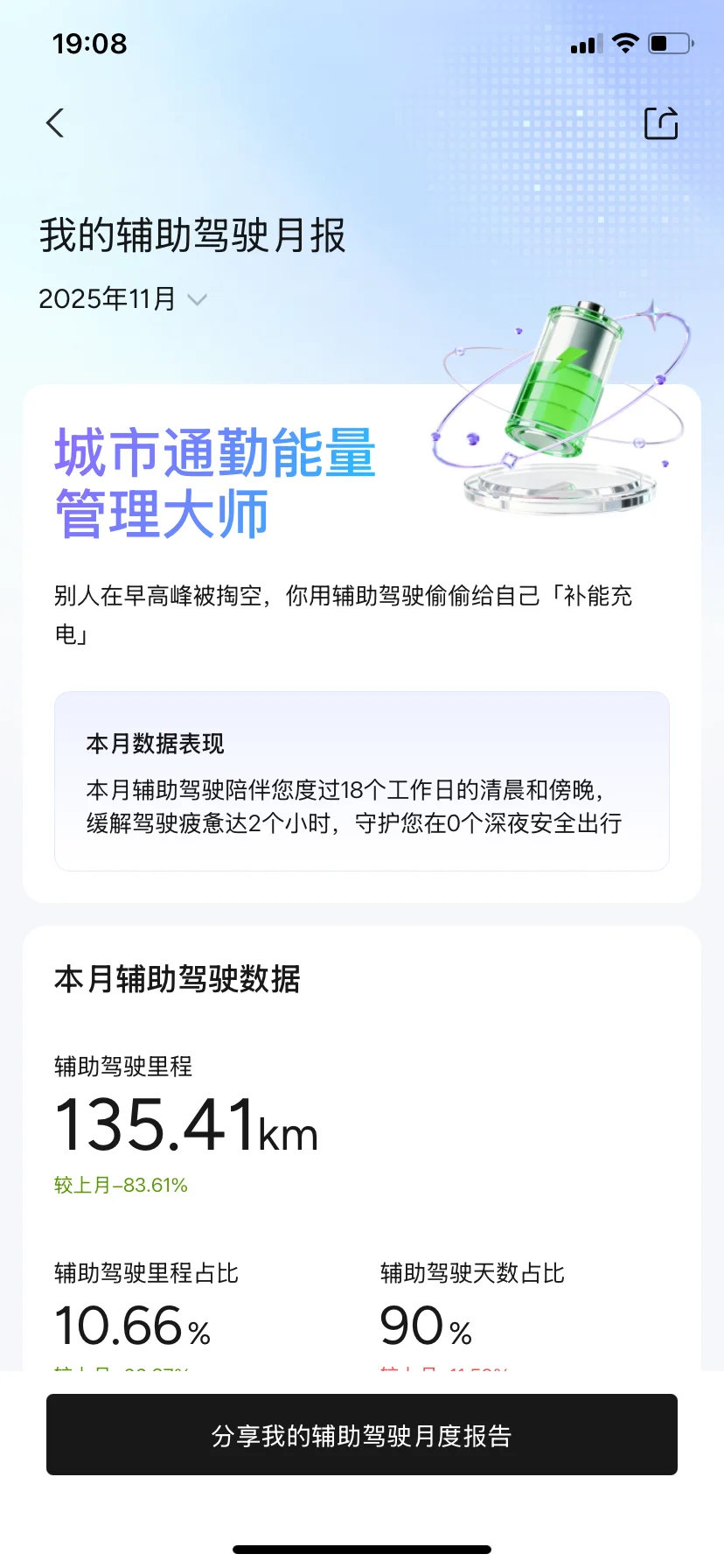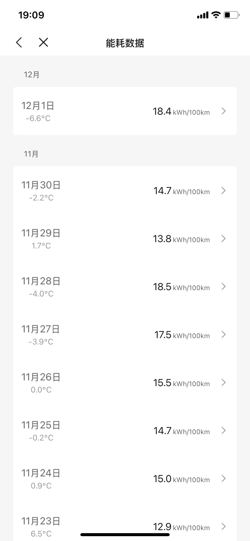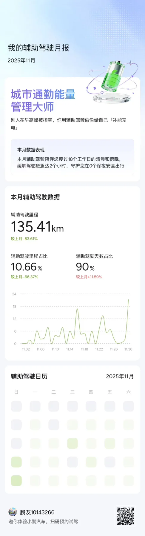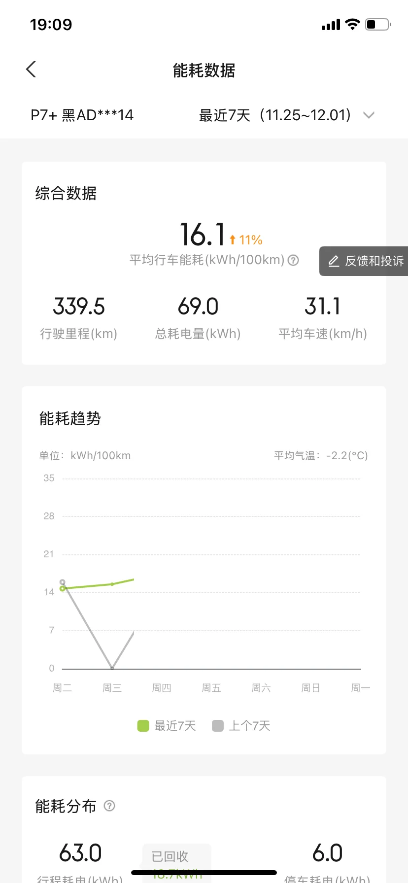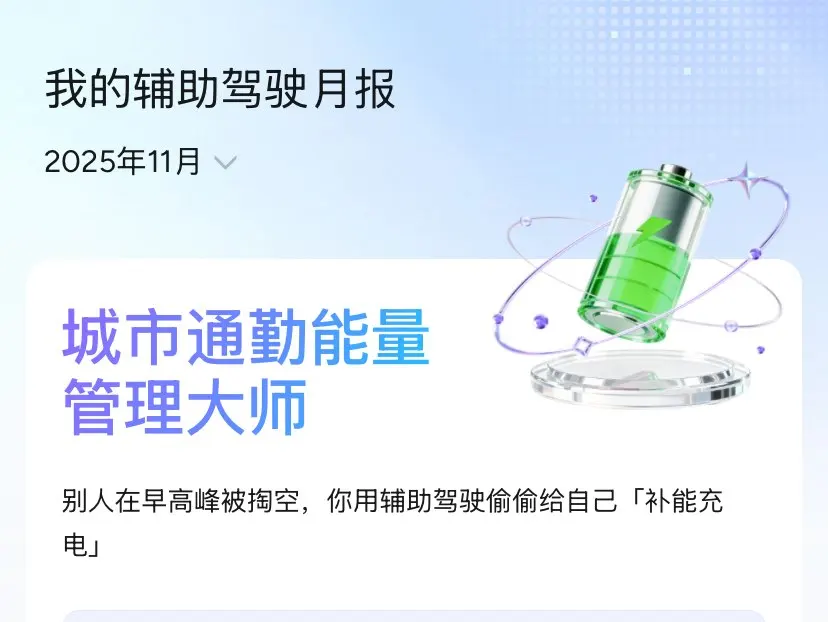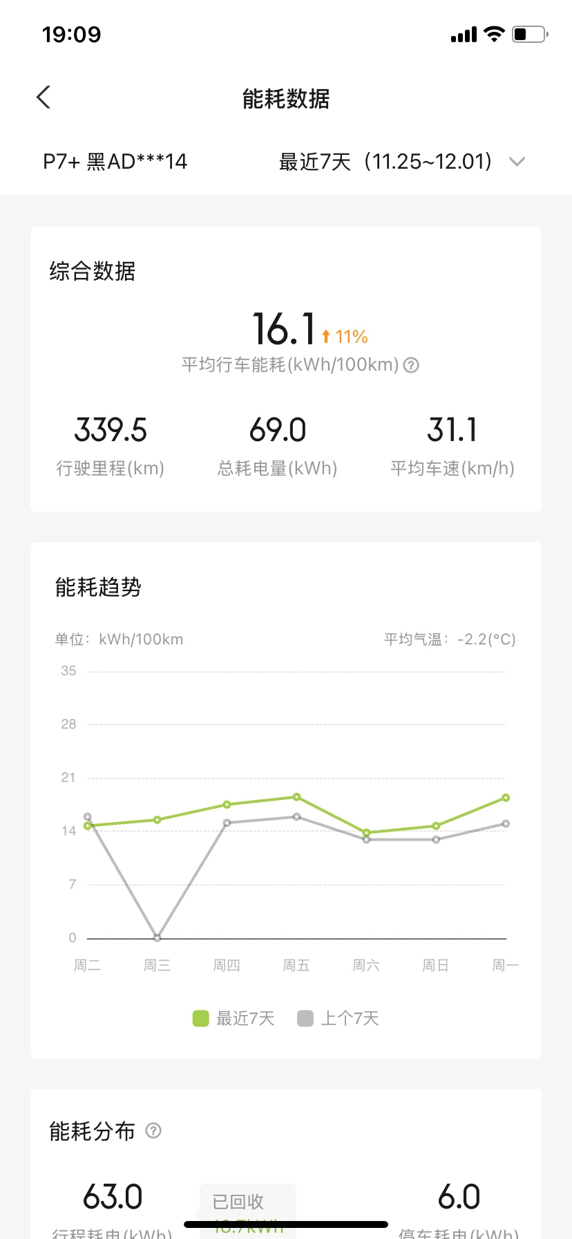 11月哈尔滨气温已达零下18度,小鹏P7+在低温环境下整体表现稳定。本月行驶里程339.5km,平均能耗16.1kWh/100km,较常温上升11%,低温导致电池活性下降是主因。总耗电量69.0kWh,其中行程耗电63.0kWh,停车耗电6.0kWh,回收电量10.7kWh,能量回收系统有效缓解续航压力。平均车速31.1km/h,以城市通勤为主。低温环境下建议优先使用预约保温功能,减少冷启动能耗;充电时可开启电池预热,提升充电效率。整体而言,车辆在极寒天气下续航表现符合预期,能耗控制合理。