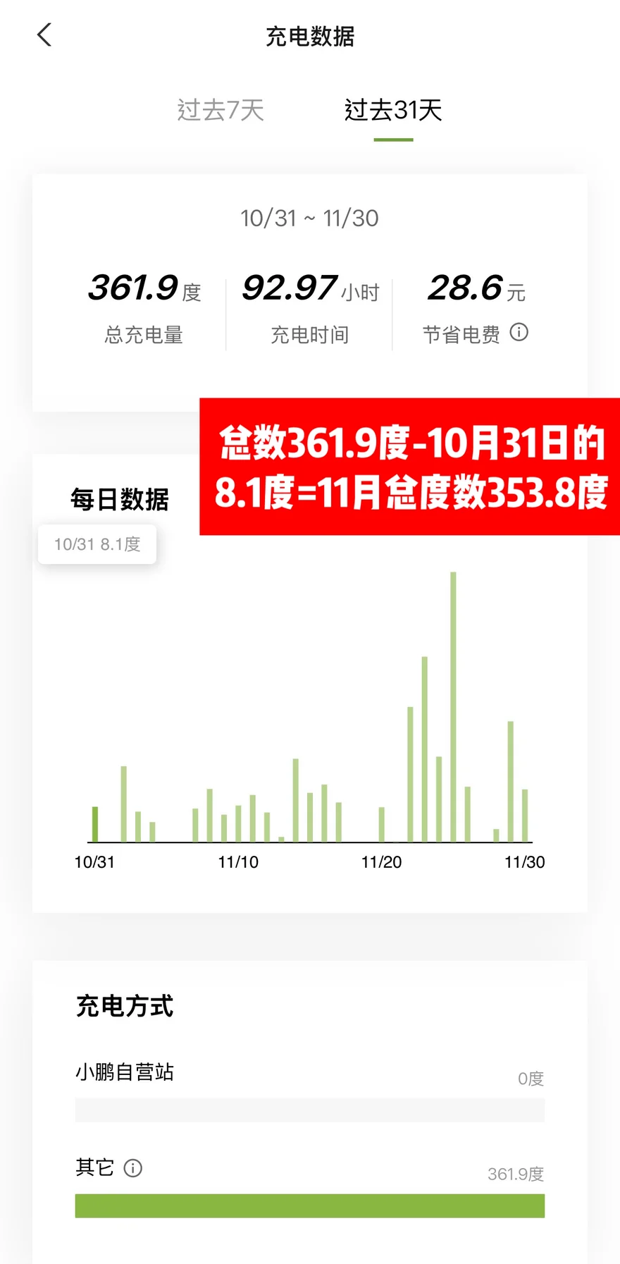 10月31日至11月30日期间,通过小鹏APP查询到总充电量为361.9度,扣除10月31日充电的8.1度,11月实际充电量为353.8度。按每度电1元的平均价格计算,本月充电总费用为354元。
