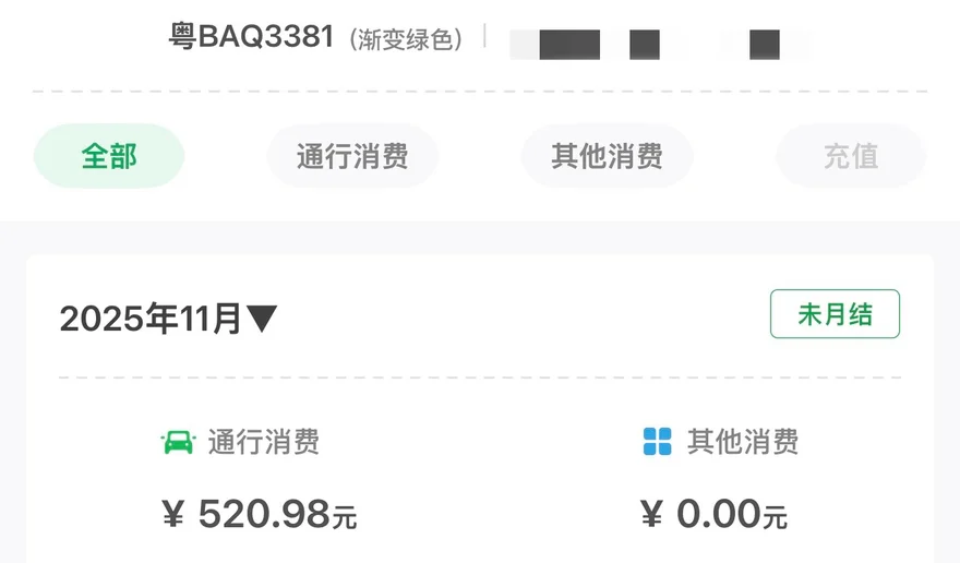 11月份因包含多次周边游及跨市出行,长途高速与市内跨区高速通行需求较多,累计产生高速通行费520.98元,成为除充电外的第二大开支。