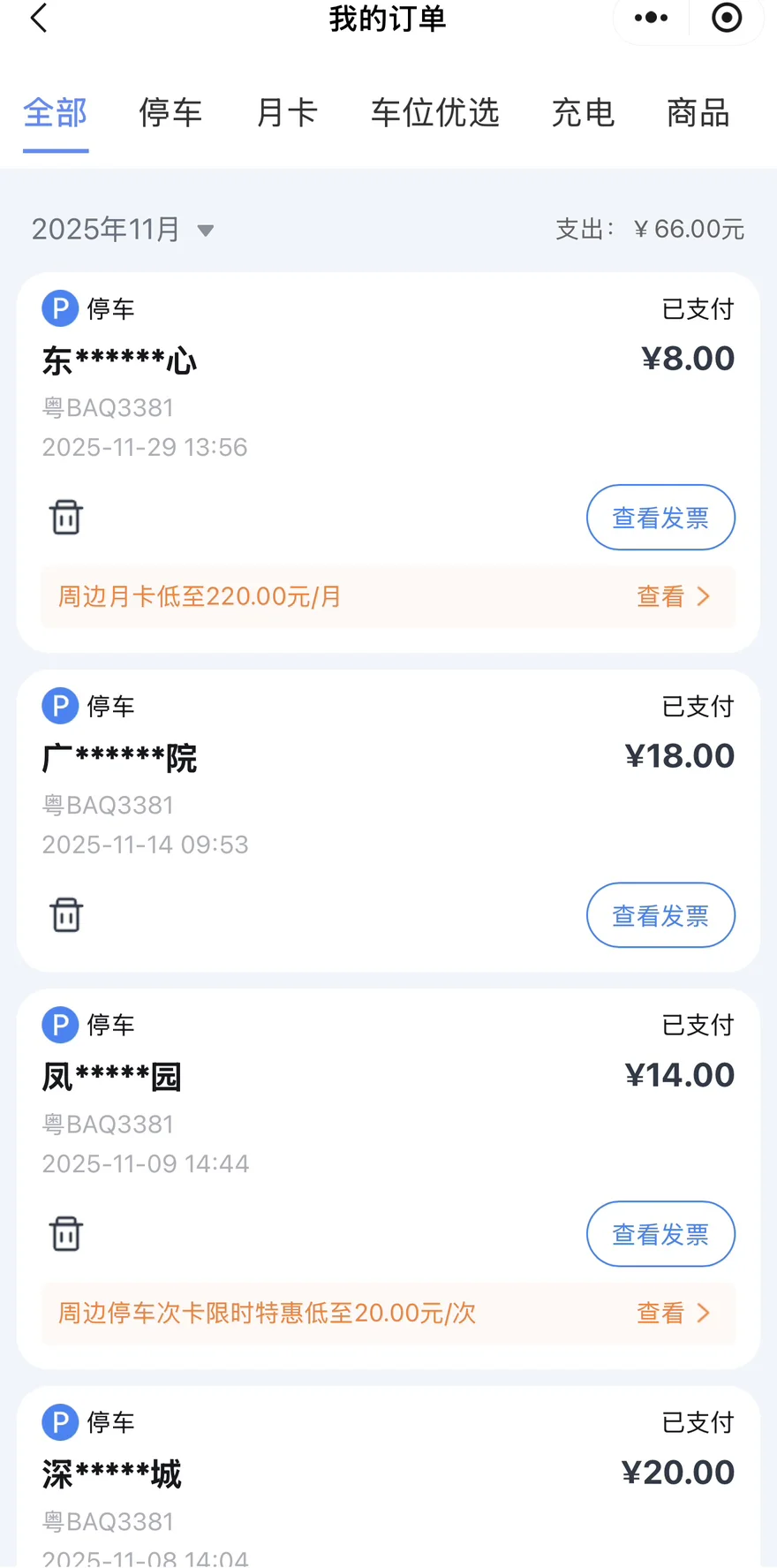 单位与小区均提供免费停车服务,大幅降低了日常停车成本。本月仅在外出游玩时产生停车费用,累计66元。停车场景包括商圈、景区等。