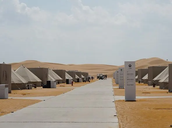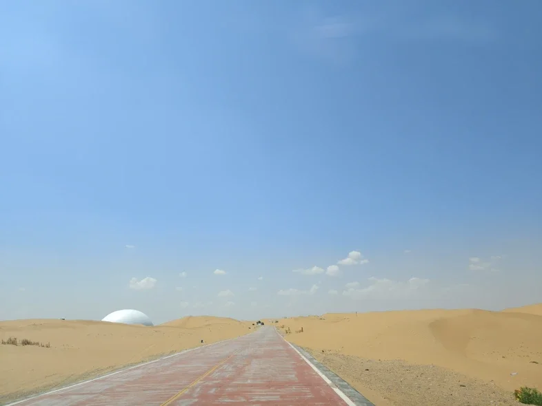 离开酒庄,我们驱车前往腾格里沙漠,通往沙漠的公路笔直延伸,红色的路面劈开金黄的沙丘,远处的白色蒙古包像散落的珍珠。
