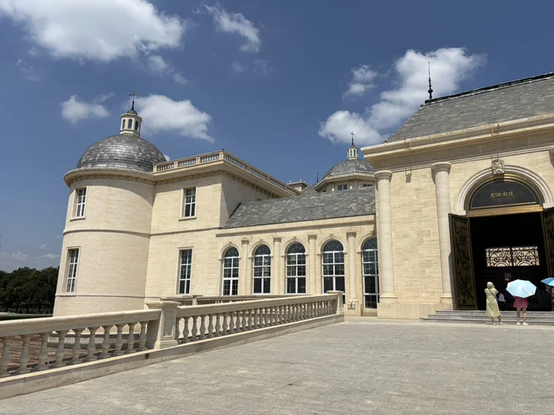 抵达龙谕酒庄时,法式穹顶的建筑矗立在贺兰山东麓,浅米色石墙与远处的山脉相映成趣,让人恍惚间以为置身波尔多。