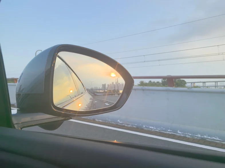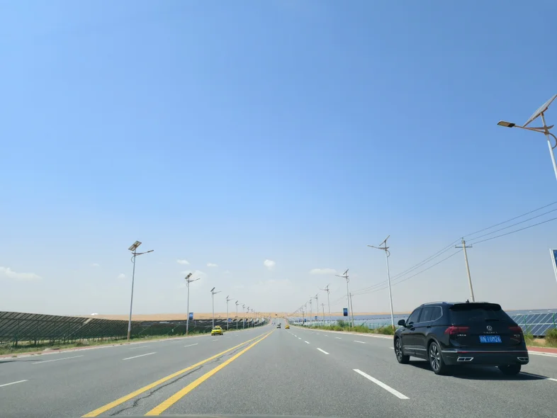 我终于不用紧盯着路况,得以安心欣赏窗外的风景:黄土高坡的沟壑渐渐被平坦的绿洲取代,夕阳把天际线染成金红色,连后视镜里的光影都成了流动的画(就像手机里存的那张夕阳行车图,每一帧都值得定格)。