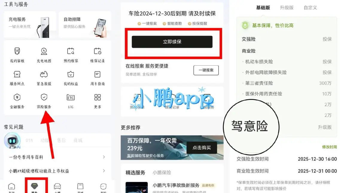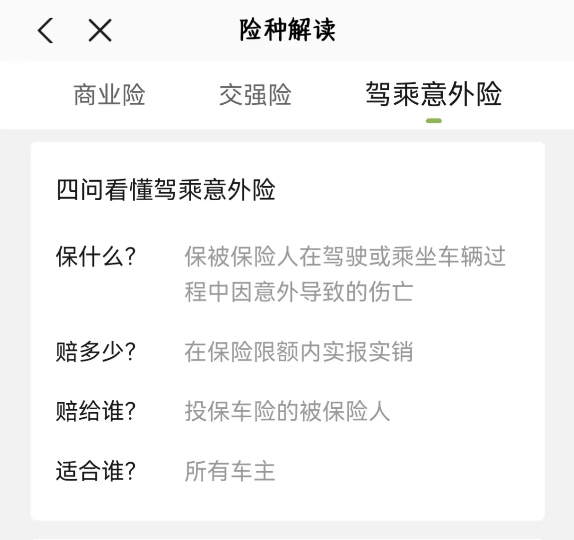 额外需要注意的是驾意险这个附加险,一般而言,这个项目就是重大伤亡时候的赔付钱,更类似于人身保险。从这里就能了解到现在各家保险公司的动不动就几百元赔付上百万的宣传源头。这里在小鹏app的保险报价里面属于备选项,详细解读如下: