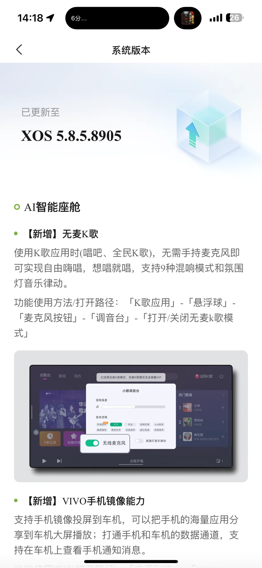 11月终于收到OTA推送了,这次升级的功能很实用,无麦K歌、AI音效,远程空调终于可以直接开启极速降温、升温了。天气冷了很好用👍