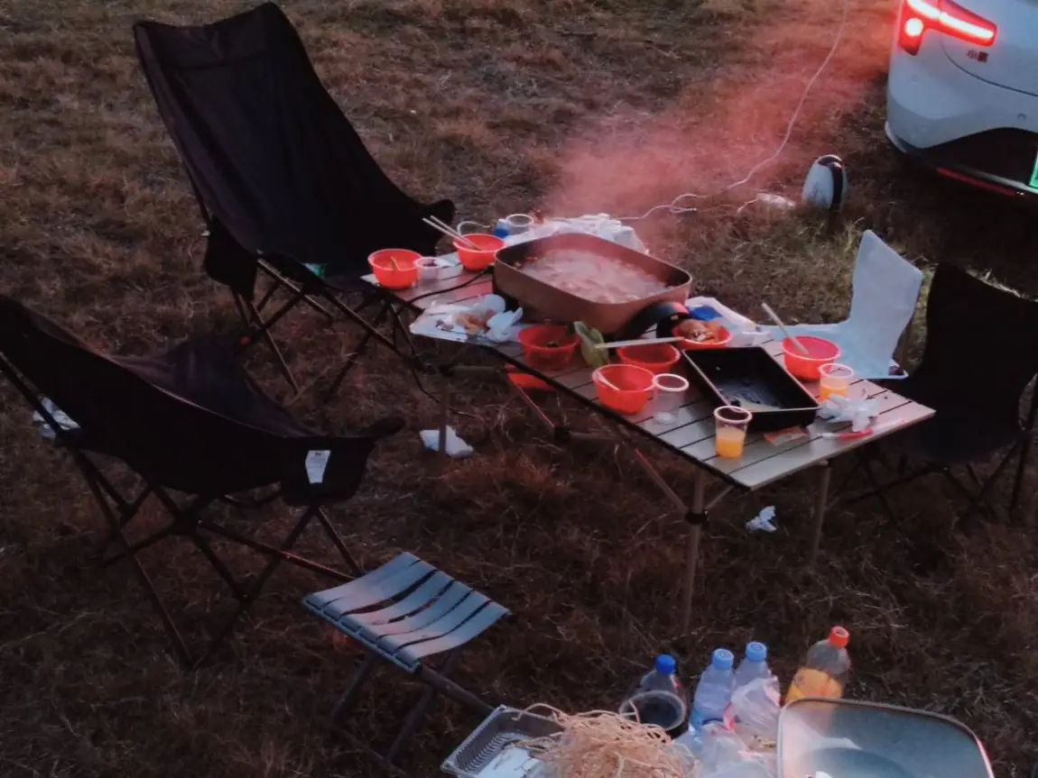 有人蹲在草里洗蘑菇,有人举着肥牛卷和夕阳比亮,M03的放电功率刚好撑得起咕嘟声,连邻座露营的大哥都凑过来问:“这小车还能当电源?”