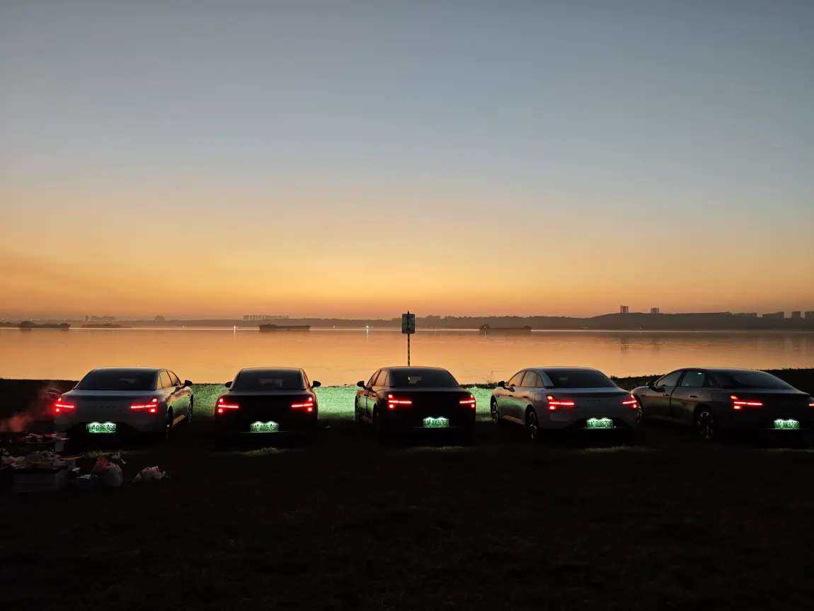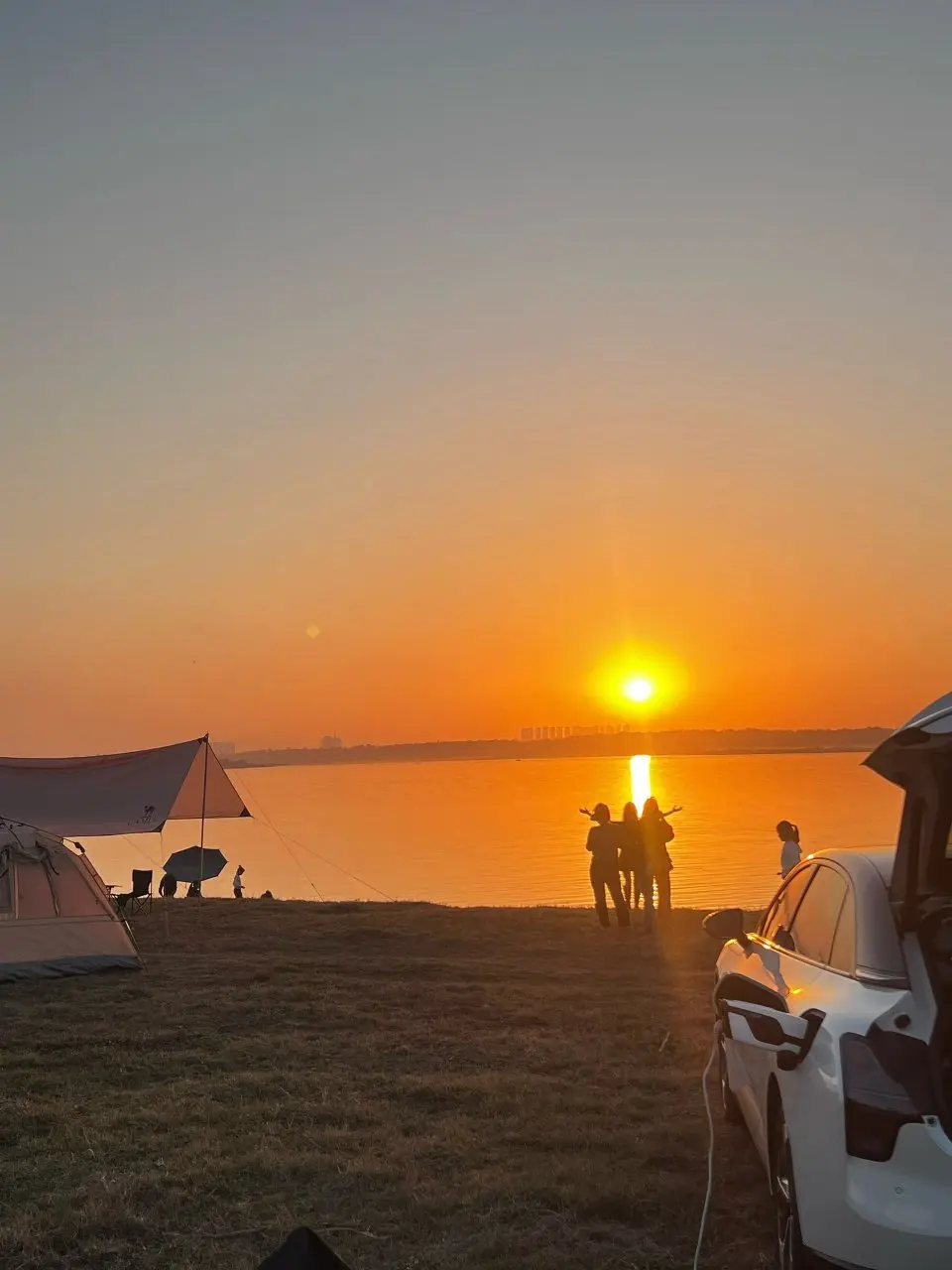 五点的落日把江面铺成碎金,我们把M03停在江边草里,车身的银色接住了粉橘色的晚霞——有人蹲在地上拍“车与落日同框”,有人躺在充气床垫上看货轮从光里驶过。