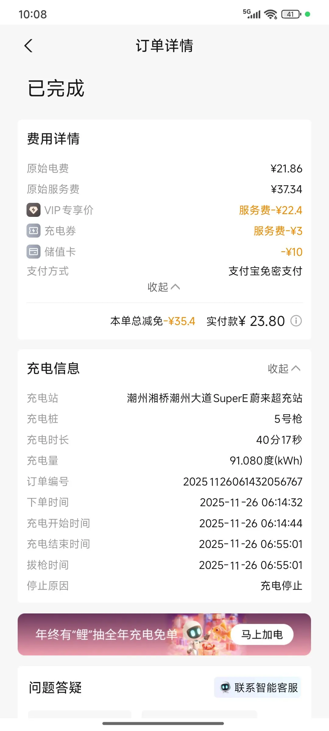 目前在县城很少小鹏自营的超充站,要么就开出15-20KM意外。但APP里的充电网点也足够,像蔚来超充站这种优质网点也接入了,而且充电环境非常好,早上价格也便宜(0.42元/度),11%-》100%,40分钟补满91度电,扣除优惠券最后实付23.8元。这也算是旅途中让人十分愉悦的事情,情绪价值真的拉满了。