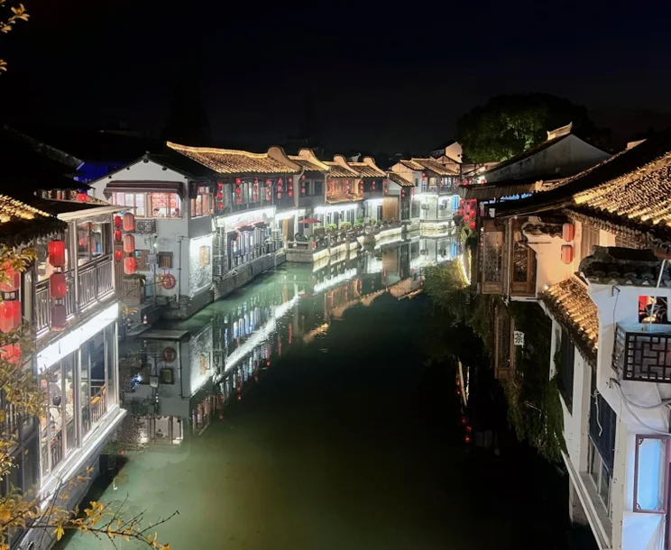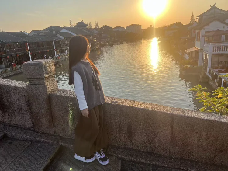 傍晚时分,奔赴朱家角古镇,导航至古镇停车场,这里停车费也是很便宜,一次20元。冬日的古镇褪去了白日的热闹,夕阳西下,余晖洒在青石板路上,给千年古镇镀上一层暖黄。放生桥横跨水巷,桥身的青石板被岁月磨得光滑,曾见证无数往来的行人;北大街的阿婆粽香气依旧,买一份热乎的扎肉,牵着闺女的小手闲逛,灯笼次第亮起,暖黄的光映在水巷里,摇橹船缓缓划过,满是江南冬日的温柔烟火气。