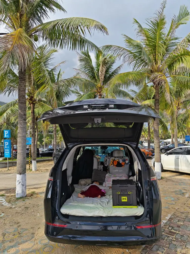 在服务区把后排放倒成床车,小朋友玩沙子累了,倒头就睡