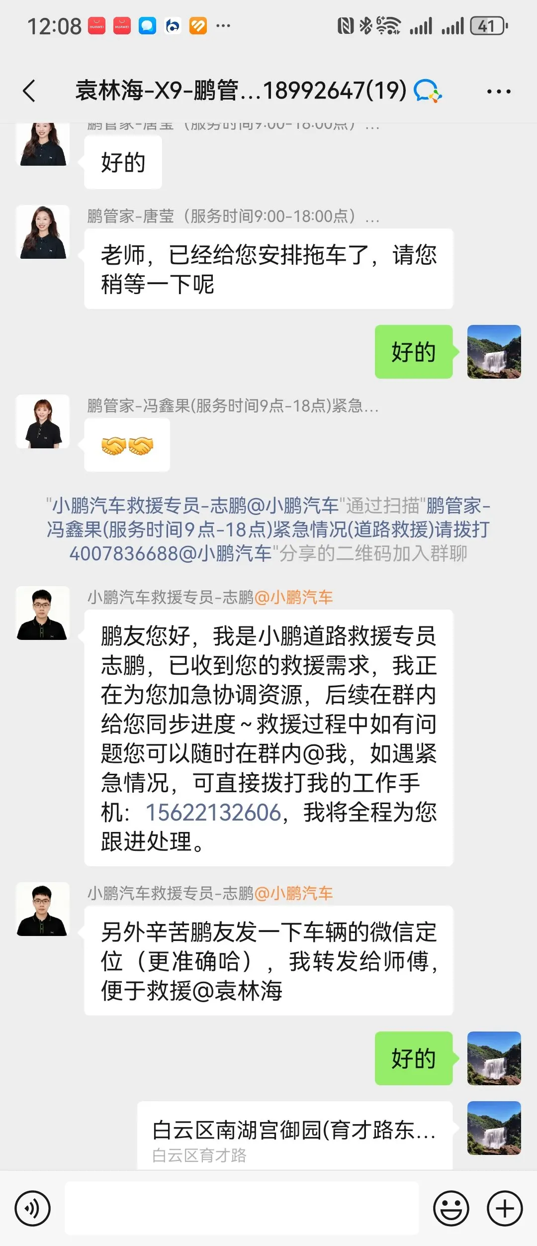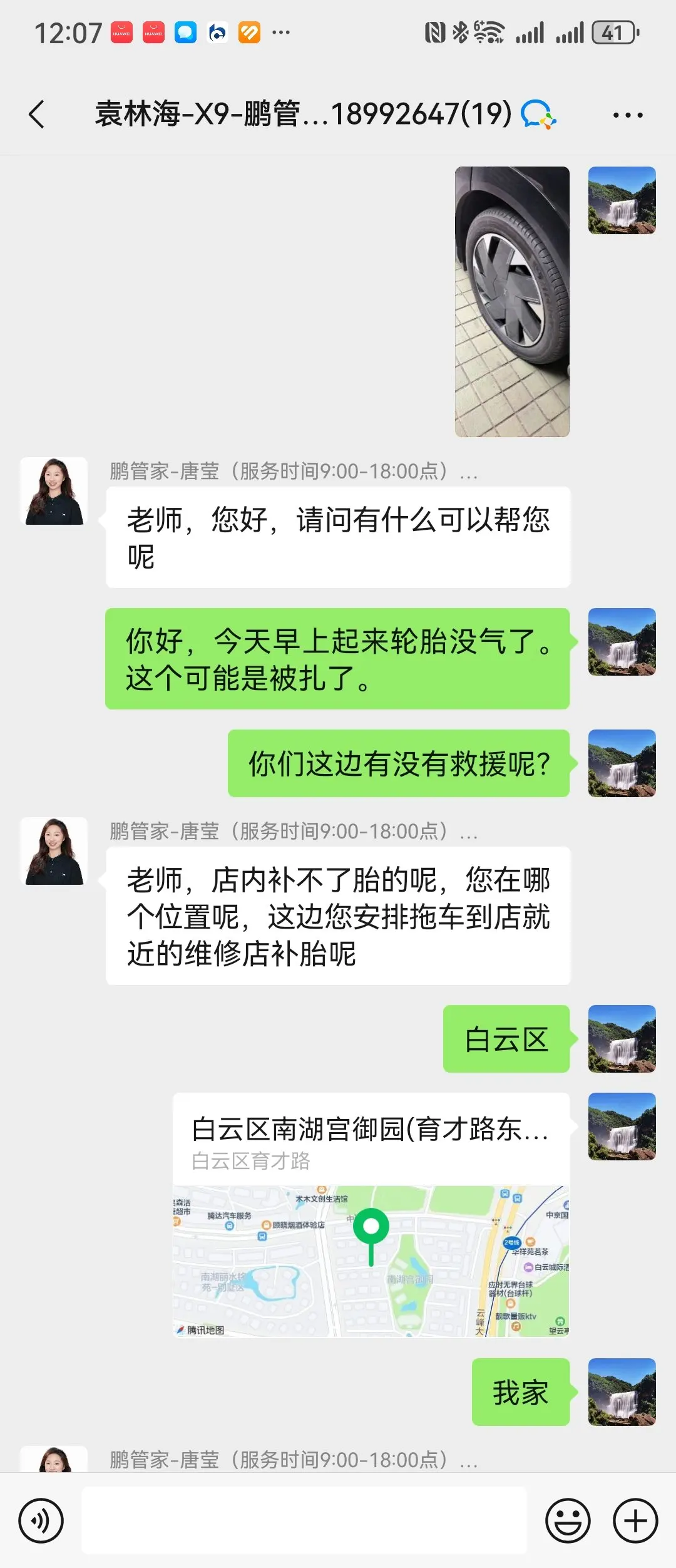 又一次感谢小鹏的紧急救援,上次去新疆旅行,已经深深感觉到小鹏的长途救援牛逼。这次仅仅是轮胎被扎,因为轮胎完全没气了,最近的补胎店离我2公里左右,不敢行驶过去,怕损坏轮胎。试着联系一下小鹏服务群,没有想到这么小的事情,专员“志鹏和唐莹”耐心的教我怎么联系上门补胎,并报销了费用,我还能说什么呢!深深感受了,作为小鹏车主的自豪,希望小鹏越来越好!给小鹏点赞👍