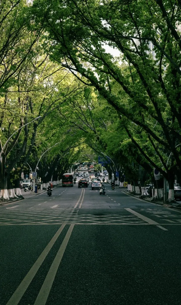 当晨间的暖阳穿过两旁苍劲的行道树,细碎的光斑便在路面上跳着舞。车轮碾过平整的柏油路,抬头是被浓绿枝叶织就的天然穹顶,阳光透过缝隙洒下来,暖融融地裹住整辆车。