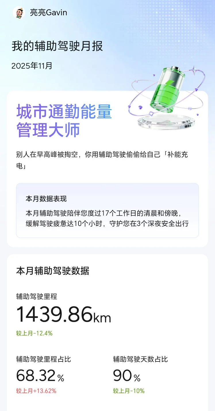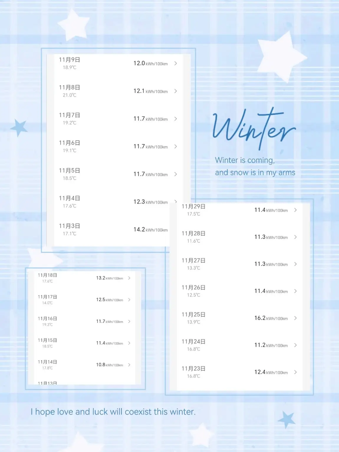 虽然已经到了秋冬季,但可以看得出江浙一带的气温还是比较高的,约在15℃上下。这个温度对于电池🔋来说,还是比较的友好🤝。所以总体上城市通勤能耗基本在11-12kWh/100km之间,高速能耗在15-17kWh/100km之间。