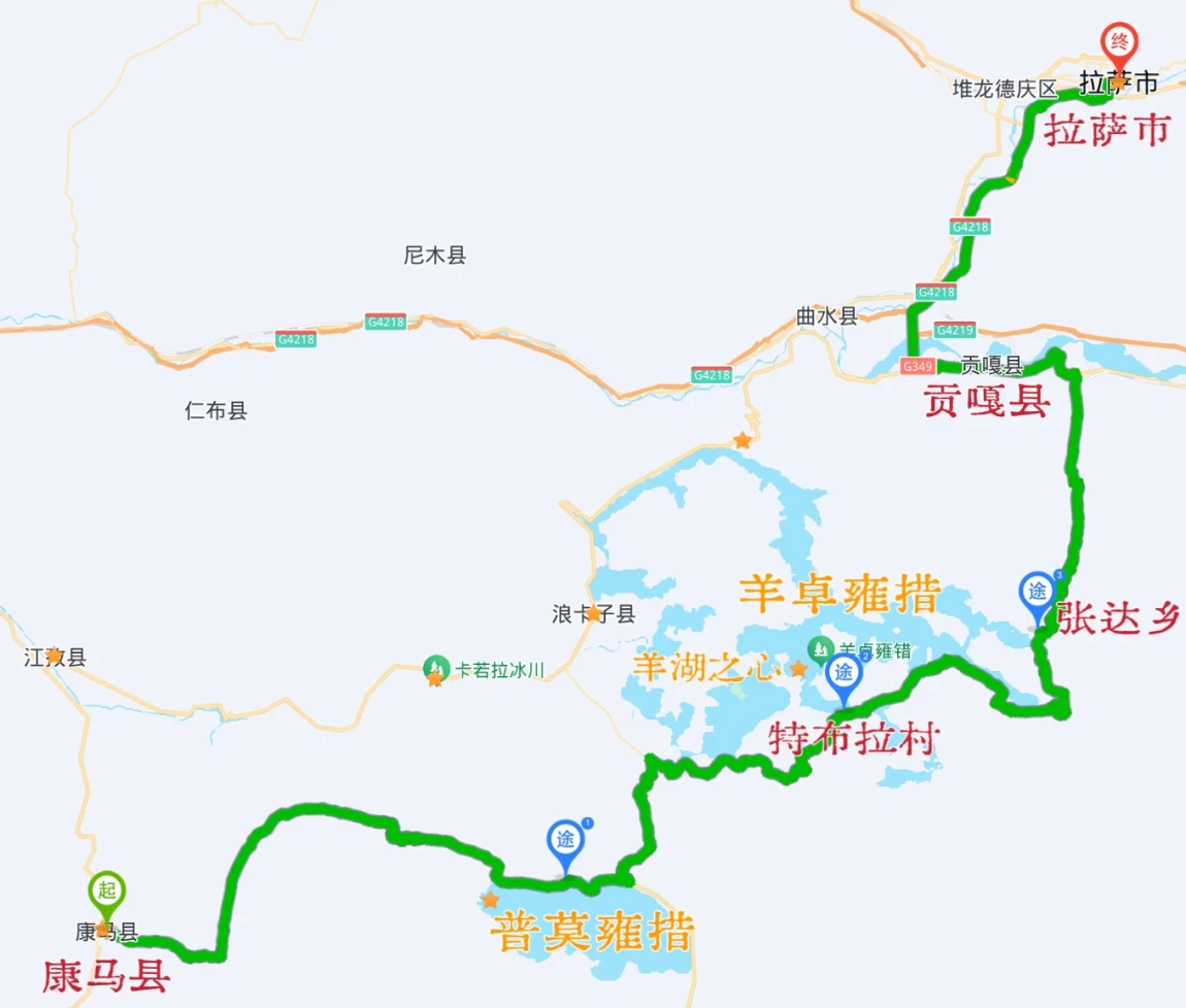 康马县-普莫雍措-羊湖南线-羊湖之心-张达乡这一路是没有充电桩的,只有抵达贡嘎县才能补电,出发前最好是充到95%以上电量。如果直接开到拉萨,总里程大概390公里,我是一次性开到拉萨,中间没有补电。到了拉萨那充电桩就不用担心了,没任何问题。