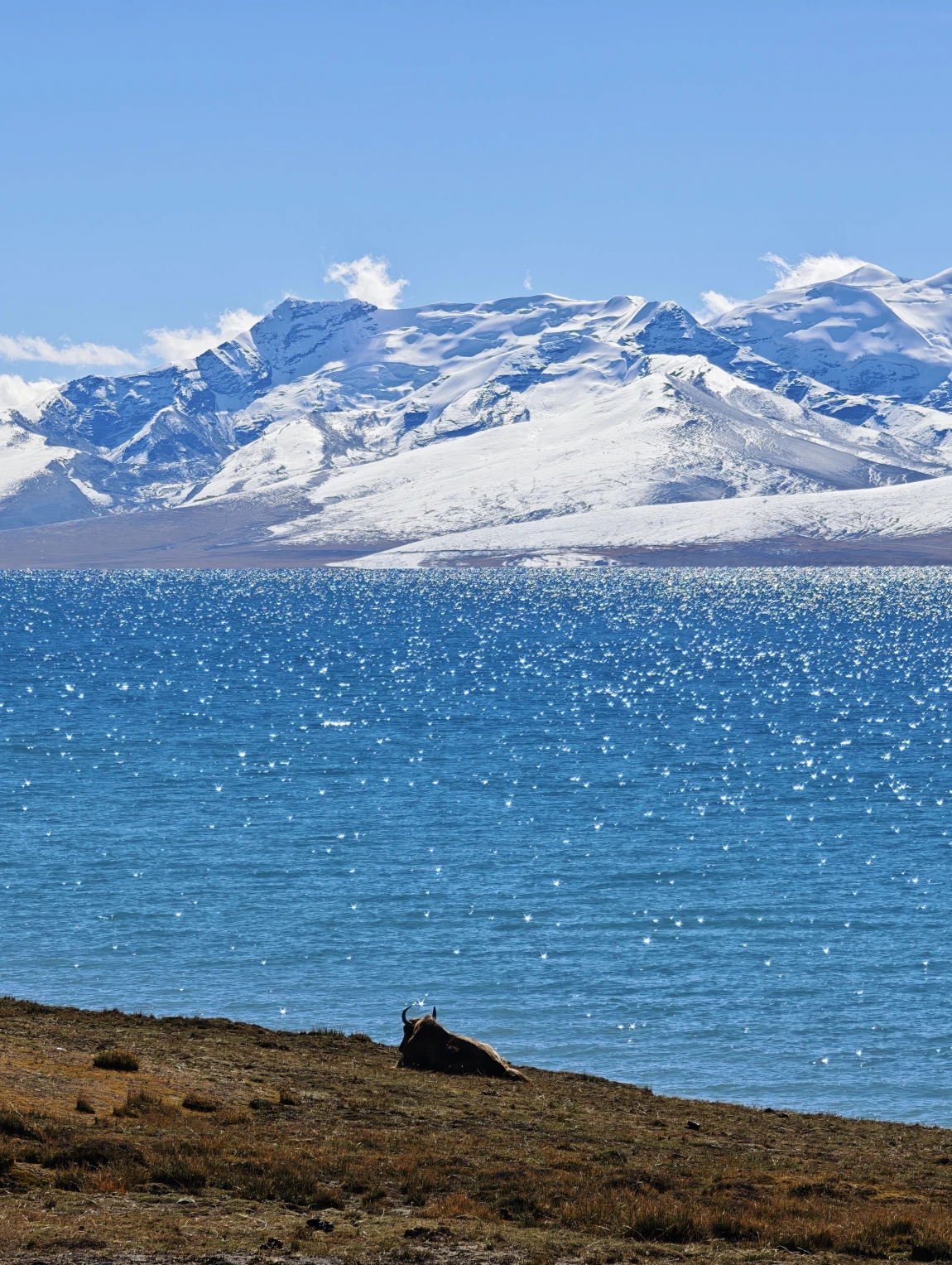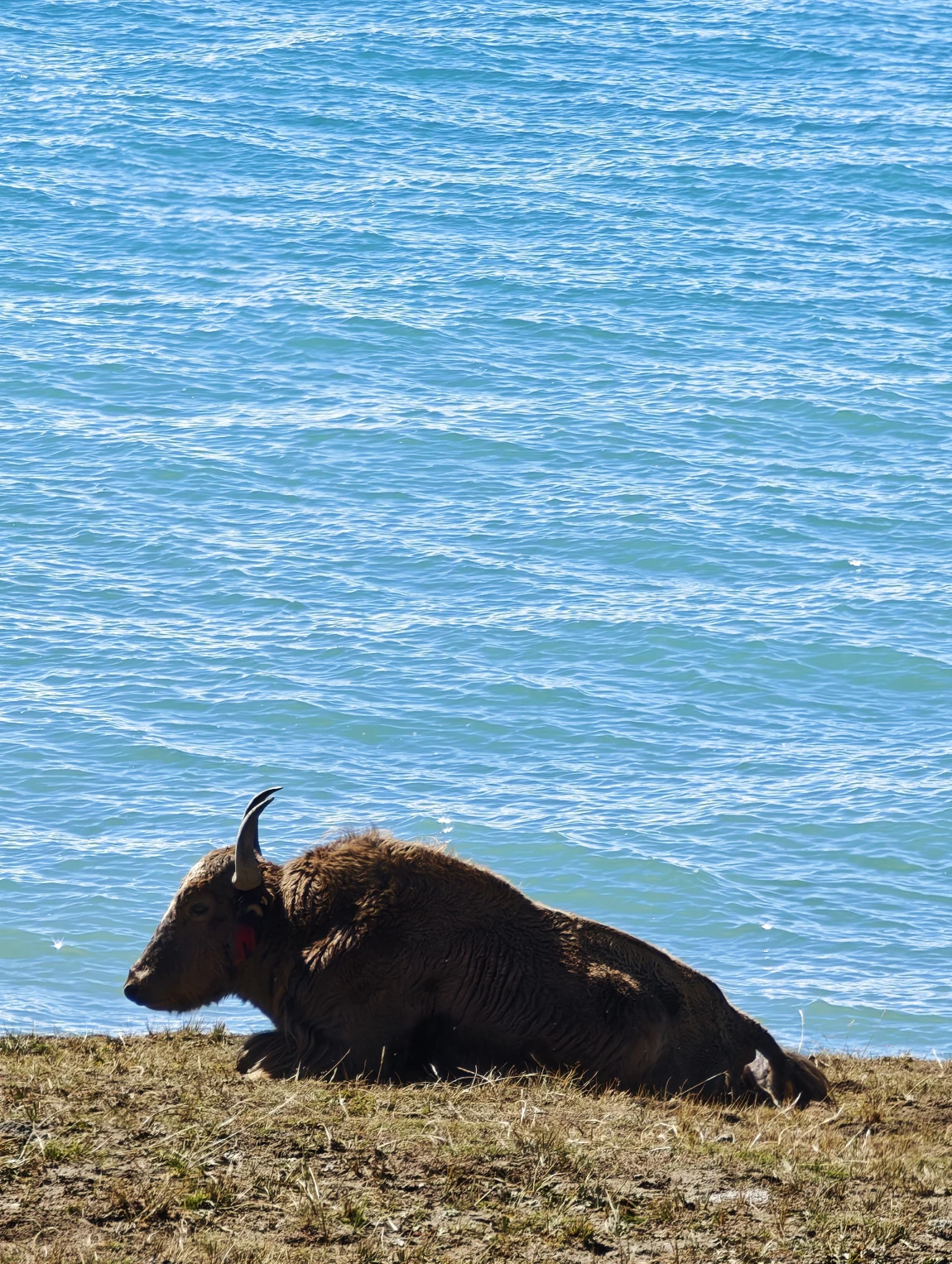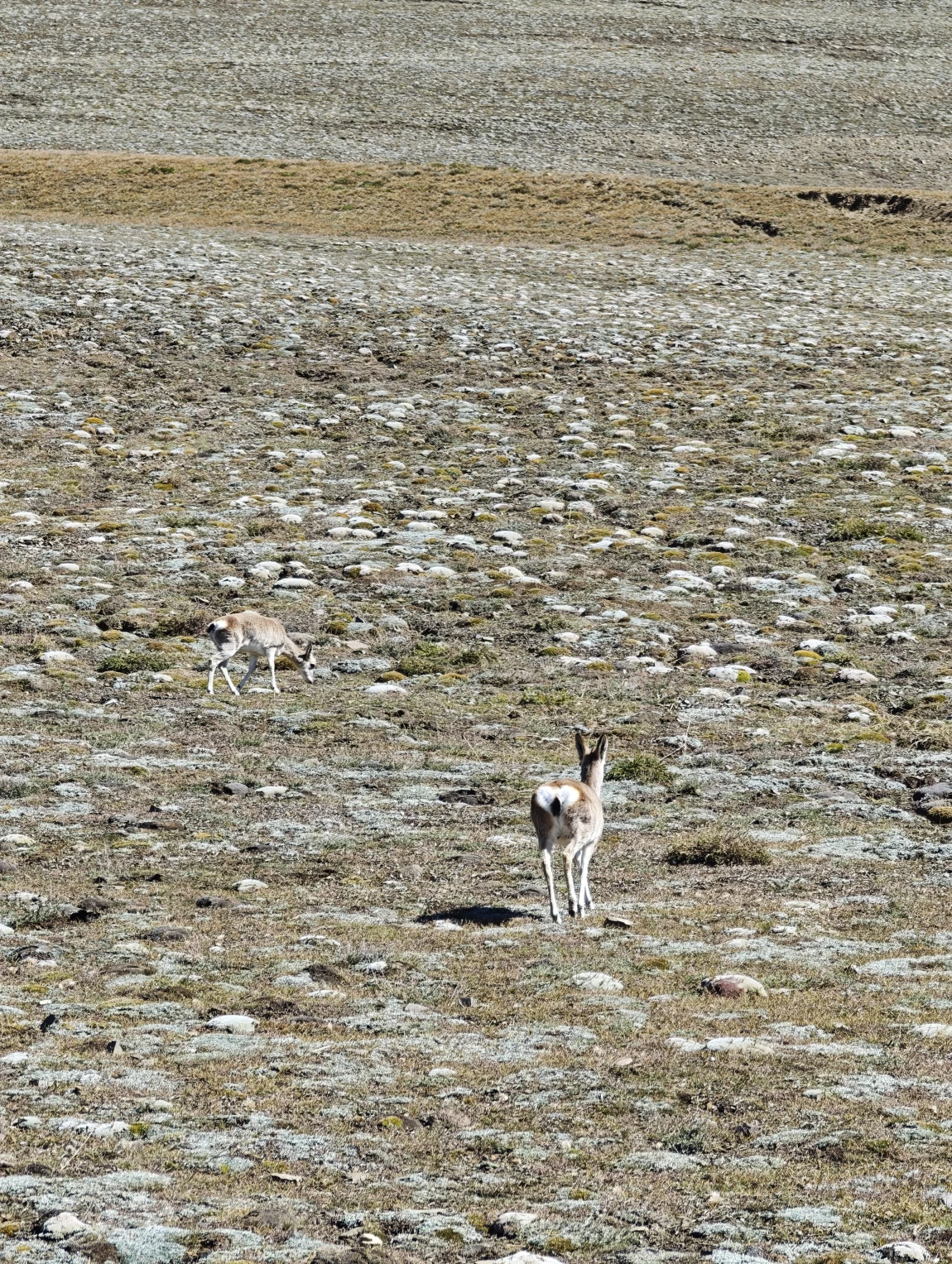 身体完全适应高反以后,即使上到5000以上的海拔也没有感觉什么不适了,翻过垭口就可以远远看见普莫雍措了。可以看到这个湖泊也是被各种雪山包围。继续沿着219国道开,一路就可以来到湖边。普莫雍措的湖水,顺光看是宝蓝色,逆光看则是蔚蓝色,湖边有不少动物,又一次看到了心形屁股的藏原羚。