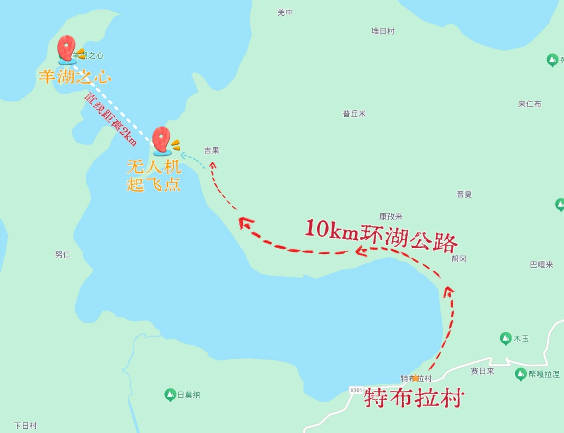 其实还有另一种方式可以看到羊湖之心:导航特布拉村,这里向北走湖边的村道,可以抵达羊湖之心的对岸,然后放飞无人机过去拍。但是现在这条路还在修建,要走的话又得开10公里的烂路😂 开到一个叫吉果的地方,向左可以看到一个被铁门拦起来的湖边牧场,我询问过当地藏民,说可以自行打开进去,但是不得破坏湖边的环境,进出都要锁门。这里进去以后就没有路了,只有车辙印,沿着车辙印再开1公里就到湖边了(下图中蓝色虚线部分),在这里向西北方向放飞无人机,就可以拍到羊湖之心,要注意直线距离2公里,而且湖边风大,需要做好随时炸机的心理准备😆
