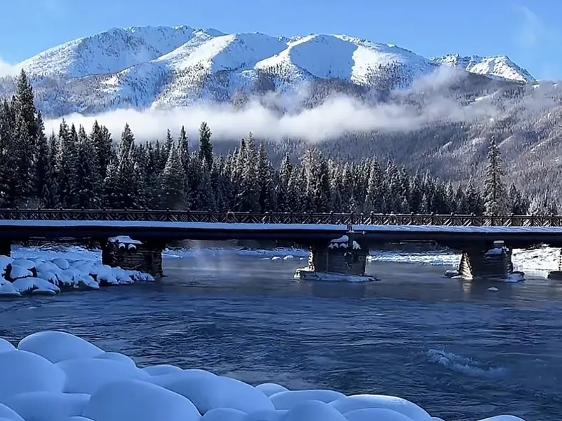 • 拍摄点:桥南入口观景平台,全景+雪山背景