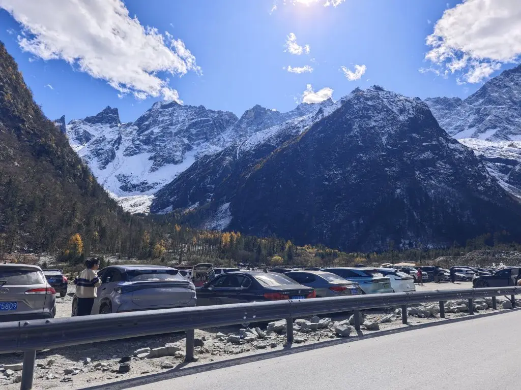 1. 毕棚沟景区门口(免费观景台):拍摄雪山公路同框
