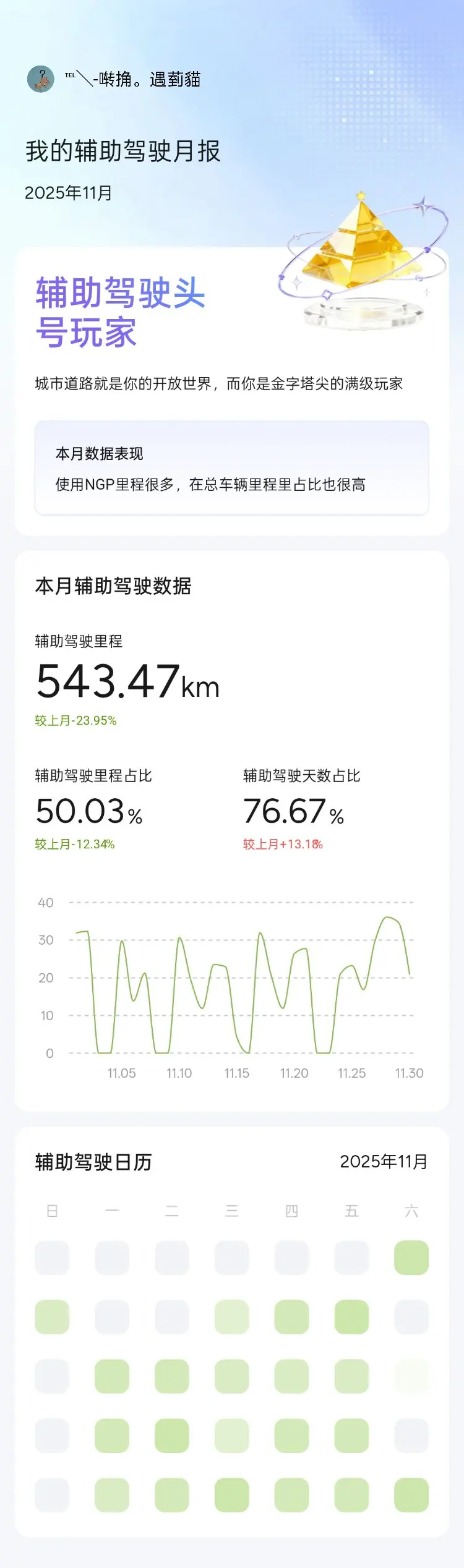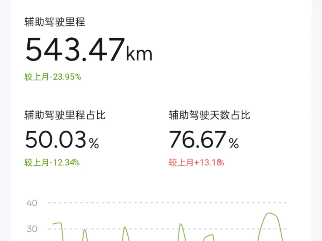 辅助驾驶方面,当月辅助驾驶里程达到543.47公里,虽然较上月下降23.95%,但辅助驾驶里程占比仍高达50.03%,接近总里程的一半。辅助驾驶天数占比更是达到76.67%,较上月增长13.18%,说明我越来越依赖NGP功能,几乎成为日常通勤的标配。