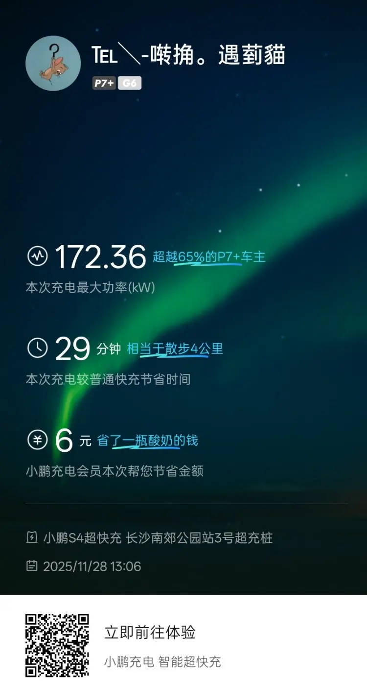 充电体验同样出色,一次充电最大功率达到172.36kW,超越65%的P7+车主,充电29分钟就能节省普通快充的时间,相当于多走了4公里。充电会员还帮我节省了6元,相当于一瓶酸奶的钱,积少成多也很可观。