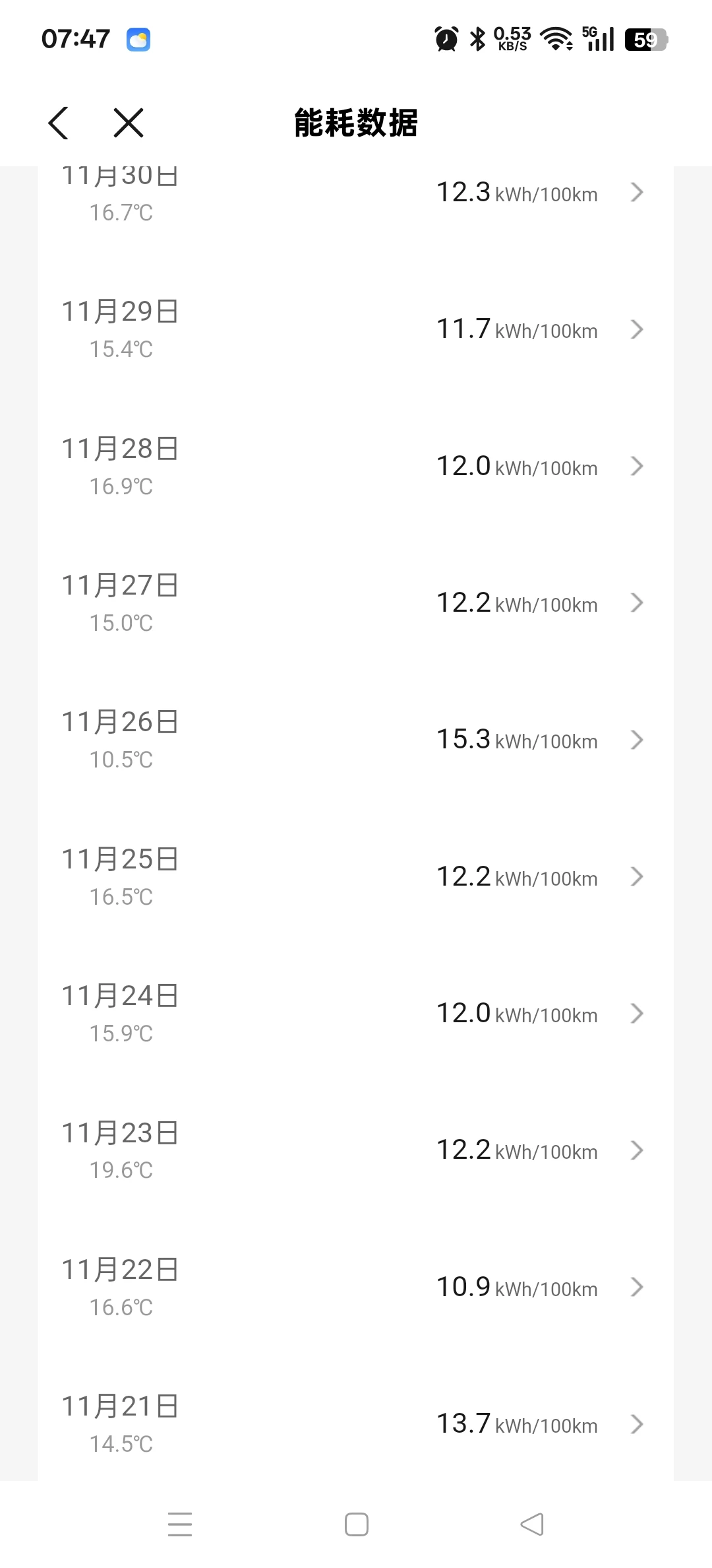 能耗方面,11月21日至30日的数据显示,百公里能耗在10.9-15.3kWh之间波动,其中22日最低为10.9kWh/100km,26日最高为15.3kWh/100km。整体能耗表现稳定,尤其是在15℃左右的气温下,能耗基本维持在12kWh/100km上下,符合预期。