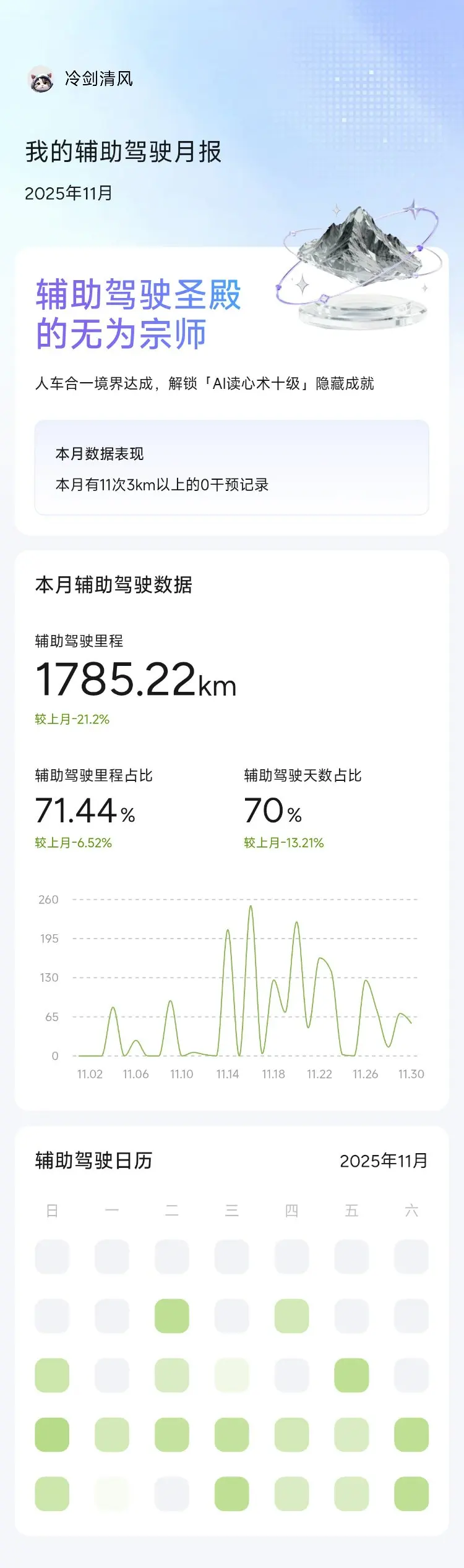 不知不觉提车已经提车3个多月了,11月开了2000多公里,其中70%多都是智驾(目前版本号:5.8.5.8906),小鹏的智驾还是比较让人安心的,带着我和我心爱的她一起走过高山,走过河流,带着我们去探索那些新奇和未知。其实不论去哪里,只要有她陪伴,就像给这段旅程装了“定心锚”。每次开启智驾模式,看着HUD上流畅规划的路线,听着她笑着说“这个自动减速好稳”,都觉得选对了车,更选对了同行的人。