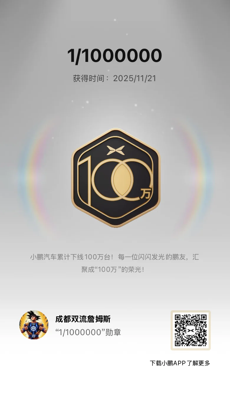 11月份,第100万辆小鹏汽车正式下线,是11年坚持技术自研及所有鹏友的信耐铸就的跨越式成长里程碑。作为新鹏友,真心为小鹏的成长骄傲!希望未来小鹏能出更多黑科技,续航再升级,服务也一直这么给力。 愿我们能一起解锁更多心动瞬间,见证小鹏越来越好,和更多鹏友共赴下一个精彩旅程!