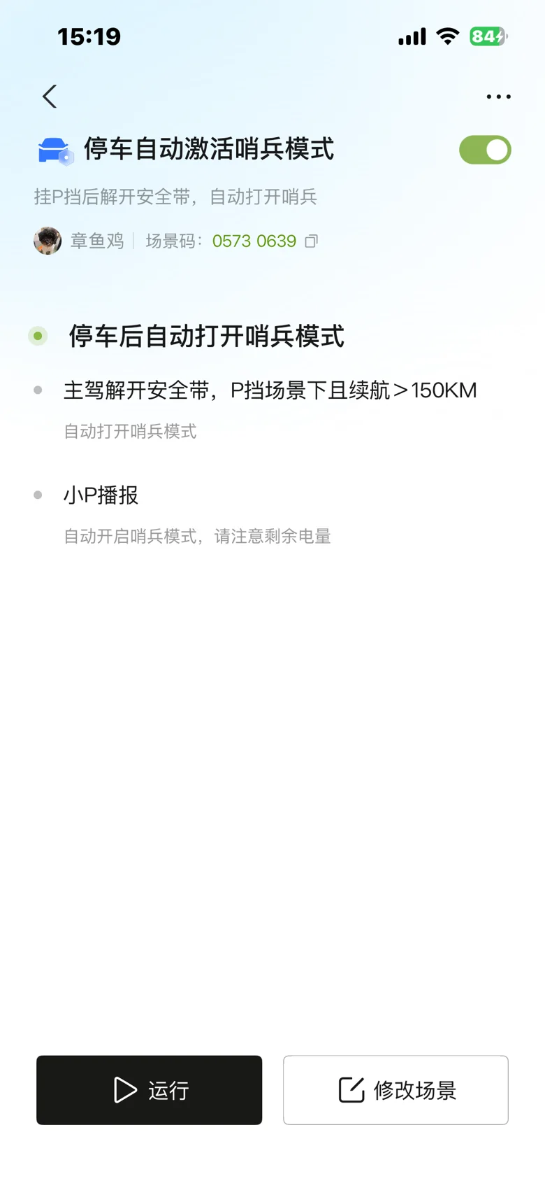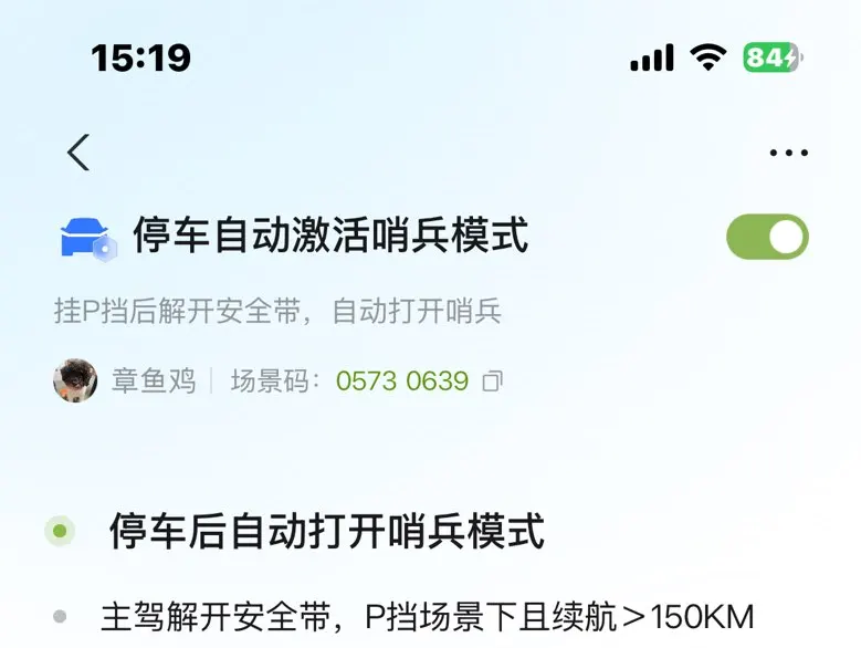 但是我认为最有价值的还是停车自动激活哨兵!(05730639),只要电量高于10%,停车后就会自动打开哨兵模式,对健忘人群非常友好,再电费如此便宜的情况下,一周开满哨兵模式才7度电.蹭上拼好电的话可能才3块多.一旦抓到开门杀的人这可没法赖账啊~ 特别是再一些车位比较窄的小区里面,这个功能帮我发现了多次开门杀的情况!